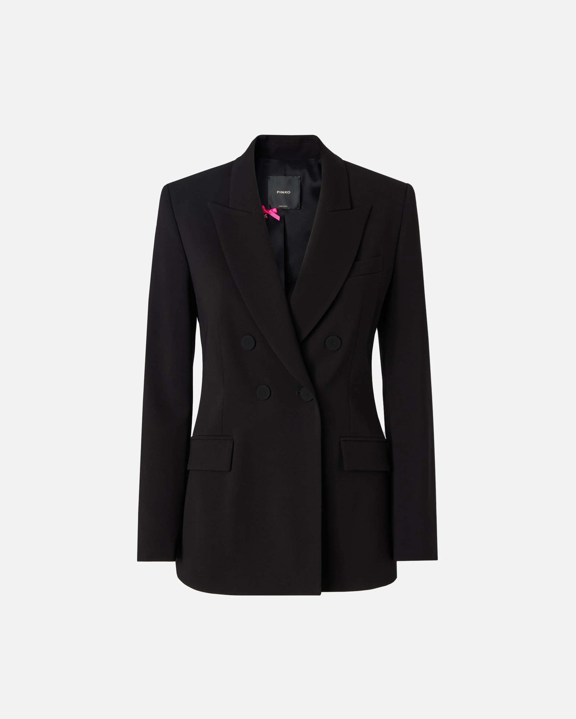 104218A2Q2-Z99 Jacket made of stretch viscose, an iconic fabric that recalls the classic cady, characterised by a soft and enveloping feel that glides naturally over the body, defining the silhouette with elegance and offering a flawless fit. This garment, which is slightly cinched at the waist and lined for a more comfortable feel when worn, features classic blazer details, including a peak lapel collar, side flap pockets and a small front pocket on the left side, and is complete with a double-breasted closure with covered buttons. Pair this jacket with the matching trousers for an elegant monochrome look, or wear it with a more casual pair of trousers for a mismatched outfit. - GELATIERA JACKET COMPOSITION Outside Fabric: VISCOSE 98% ELASTANE 2% - Lining: ACETATE 67% POLYESTER 33% MEASURES W: 0.78 g