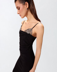 106637A31P-Z99 A tank top with a wide round neckline, crafted from viscose crepe with a fluid, flowing hand. This piece is a true gem, thanks to its distinctive pinstripe-inspired design, achieved by alternating small cube-shaped metal elements and hand-embroidered crystals. Thanks to its versatile yet elegant design, it's the perfect under-jacket paired with tailored trousers, but also with a special pair of jeans. COMPOSITION Outside Fabric: VISCOSE 98% ELASTANE 2% - Lining: POLYESTER 90% ELASTANE 10% - : Glass 70% POLYESTER 20% Metallised Fibre 10% Metallic fibre 10% - : POLYAMMIDE 100% POLYAMIDE 100%