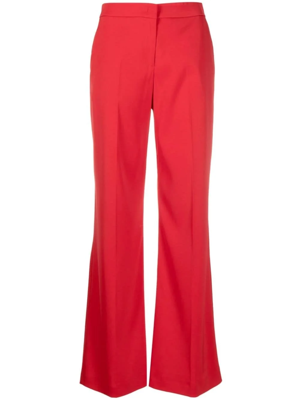 flared tailored trousers bright red tailored design concealed front fastening flared hem two rear welt pockets Made in Italy Composition Outer: Polyester 97%, Spandex/Elastane 3% Lining: Polyester 100% SIZE & FIT Model measurements Height 5 ft 9 in(1.76 m) Bust/Chest 33.07 in(84 cm) Hips 38.58 in(98 cm) Waist 24.8 in(63 cm) FittingInformation This piece fits true to size. We recommend you get your regular size Designed to be fitted at the waist and hips, loose over the leg Made with a mid-weight stretch fabric