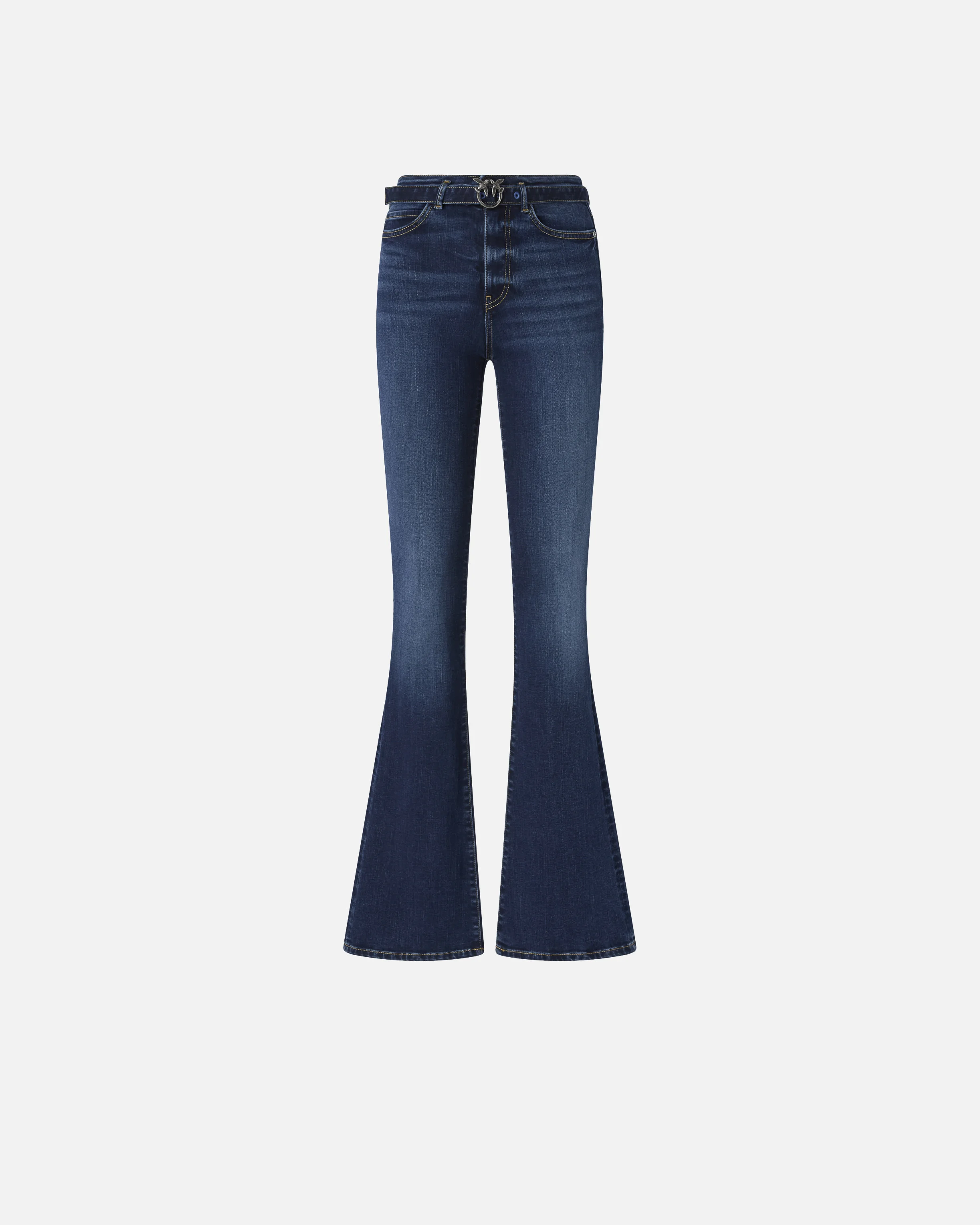 FLORA FLARE − 100166A2RXPJB Flared five-pocket jeans with a fitted leg to the knee that flares on the hem, made from cotton-blend power stretch denim with a soft hand. The fabric used is a high recovery denim that does not lose its shape easily and thus will retain its original shape over time. The brand's lettering logo embroidered on the back of the waistband and the Love Birds logo with embroidered birds on the right back pocket add pure PINKO style to the design. Complete with a matching-fabric belt with the metal Love Birds Diamond Cut buckle. Mid-rise with belt loops and a zip and button fastening. COMPOSITION Outside Fabric: COTTON 71% POLYESTER 18% VISCOSE 9% ELASTANE 2% - Lining: POLYESTER 65% COTTON 35%