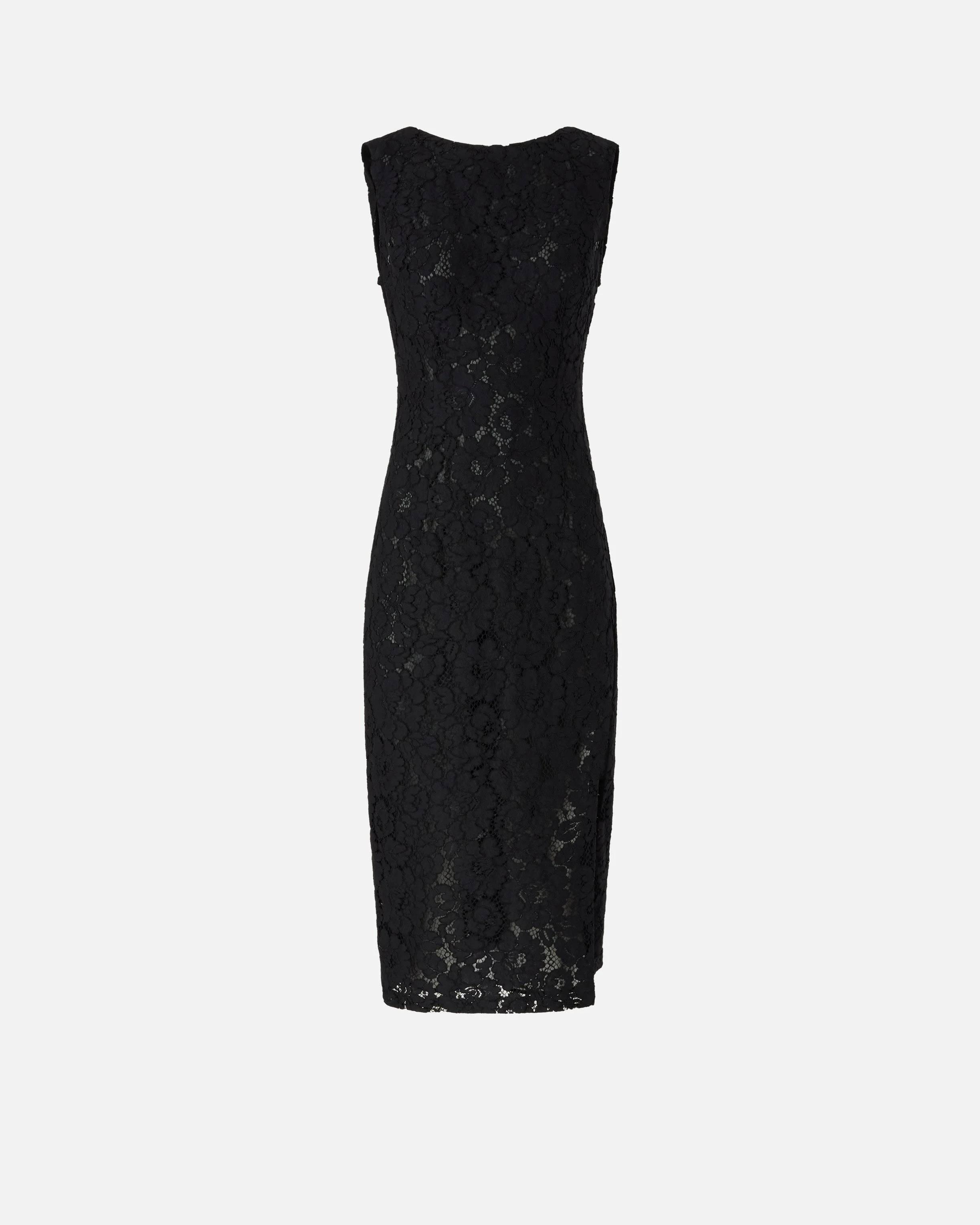 106588A330-Z99 Sleeveless, slim-fitting dress with boat neck at the front that opens into a plunging V-neck at the back for a touch of refined sensuality. The undisputed star of this piece is the sophisticated rebrode lace detailing, whose rich floral motifs are embroidered in a way that makes them appear three-dimensional, providing a striking, seductive end look. This garment, featuring a convenient zip at the back and inner lining that makes it easy to wear, is complete with an inverted pleat on the back that lends depth and a side slit at the front that provides extra charm. This elegant dress is perfect for wearing on special occasions, whether as an evening outfit or as a ceremony look. COMPOSITION Outside Fabric: COTTON 64% POLYAMMIDE 21% POLYAMIDE 21% VISCOSE 15% - Lining: POLYESTER 100% MEASURES W: 0.4 g