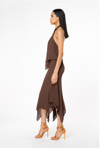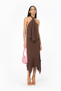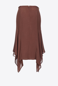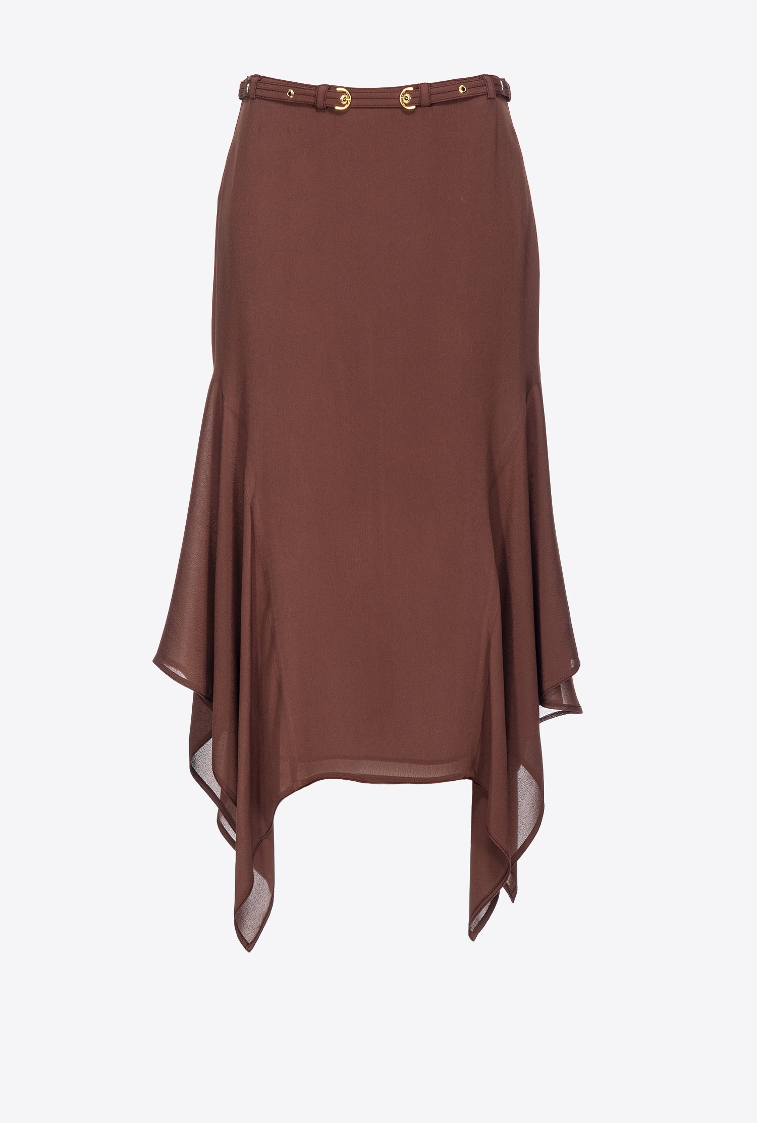 Flowing, calf-length skirt in viscose crepe de Chine with striking vintage effect. Strap-effect waist appliqué with small metal buckles and eyelets, and asymmetric handkerchief hem. Invisible zip fastening in the middle at the back. COMPOSITION Outside Fabric: VISCOSE 100% - Lining: POLYESTER 100%
