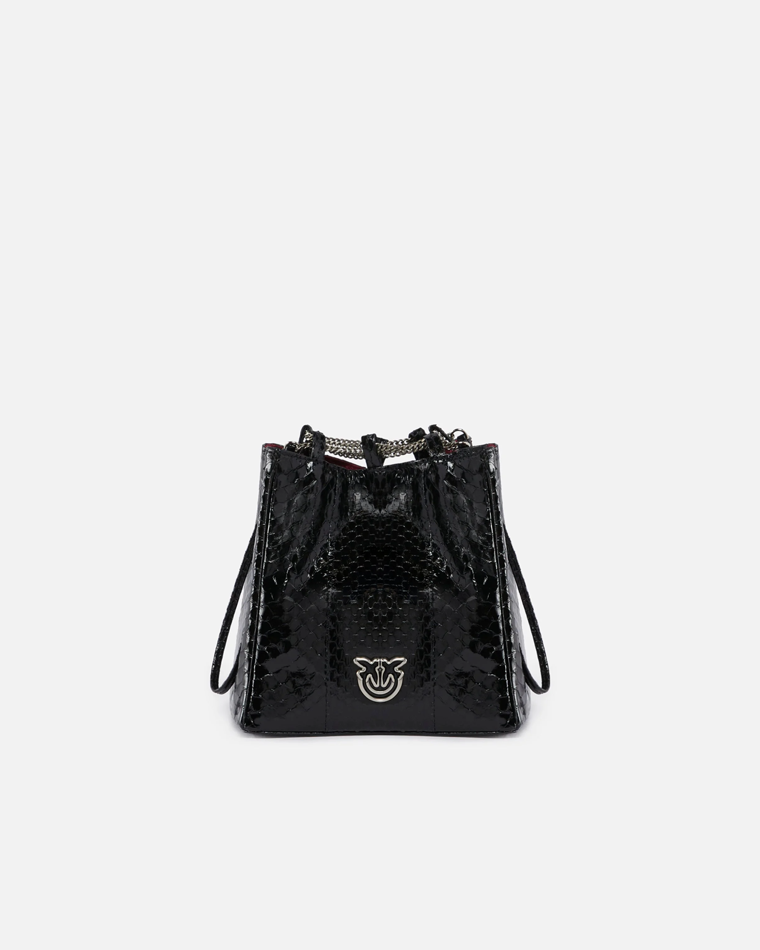 104423A28G-Z99O Small mini bucket bag clutch crafted from ayers reptile python skin with a distinctive shiny finish. This distinctive type of leather is placed on the bag and then applied by hand on each model: depending on the leather used, each bag is therefore utterly unique and so any imperfections are to be considered a characteristic and distinctive detail. This small bucket bug is lined in contrasting fabric and a chain closes it to keep your essentials safe. The small bag is complete with slim handles for carrying it by hand, making this accessory a true must-have for special occasions. It is made even more precious by the Love Birds Diamond Cut logo tag in tonal enamelled metal. The bag is part of the Limited Edition special capsule collection which comprises PINKO Galleria-exclusive limited-edition models. Use the special NFC chip to enjoy a special experience, specific to the bag you have just bagged! COMPOSITION Leather: SNAKESKIN LEATHER 100% SNAKESKIN 100% - Leather: CALF LEATHER 100% CALFSKIN LEATHER 100% - Lining: VISCOSE 100% MEASURES W: 0.43 g H: 16.0 cm W: 9.0 cm L: 15.0 cm