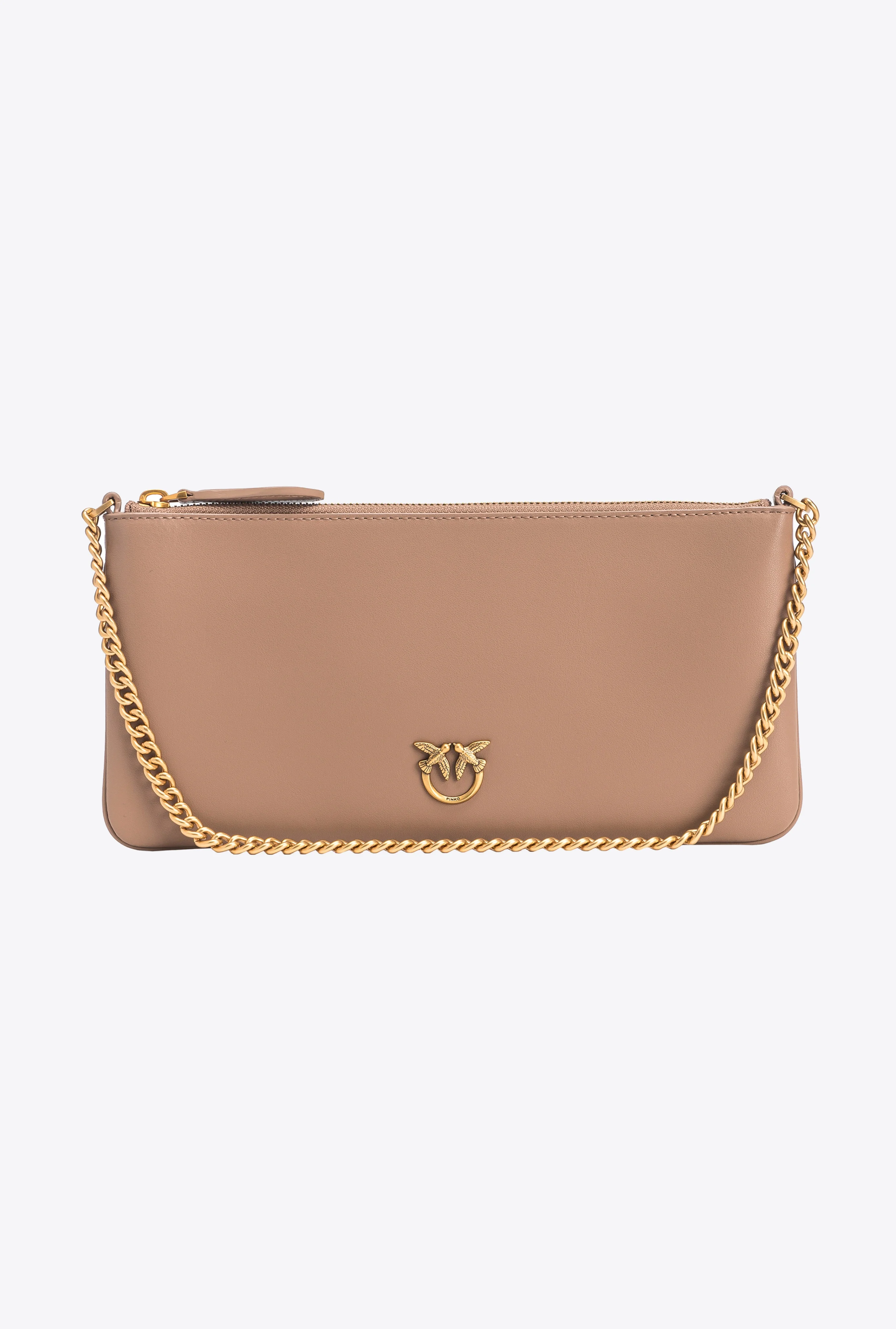 Flat, elongated crossbody bag in soft, silky leather. Customised with antique gold-electroplated Love Birds Diamond Cut plaque. Lined with polycotton and complete with thin chain shoulder strap. Zip fastening. Activate your PINKO bag: verify the authenticity of your product and access a personalised experience by scanning the Love Birds embroidery on the back of the bag with your smartphone! COMPOSITION Outside Fabric: COWHIDE 92% BOVINE SKIN 92% POLYURETHANE 8% - Lining: POLYESTER 100% - Material: POLYAMMIDE 50% POLYAMIDE 50% POLYURETHANE 50% MEASUREMENTS - Height: 13 cm - Width: 2 cm - Length: 28 cm