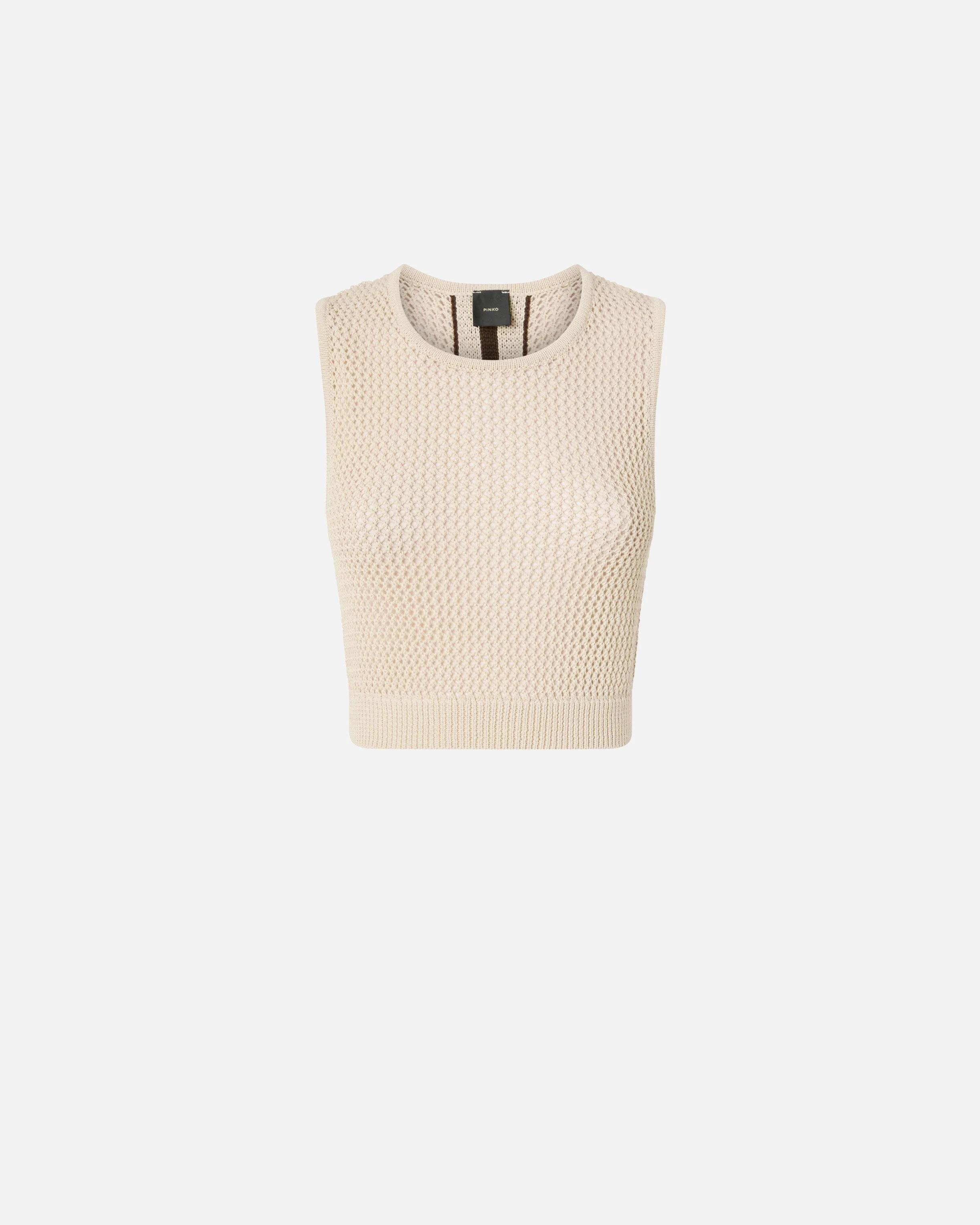 106837A3B4-C44 Sleeveless crop top with racer-style back, made from soft, fresh cotton-blend fabric with mesh-effect openwork detailing. Perfect for giving sporty looks a cool twist, this model features contrasting bands on the back accompanied by a label featuring jacquard PINKO logo lettering. COMPOSITION Outer Yarn: COTTON 62% POLYAMIDE 38% POLYAMMIDE 38%
