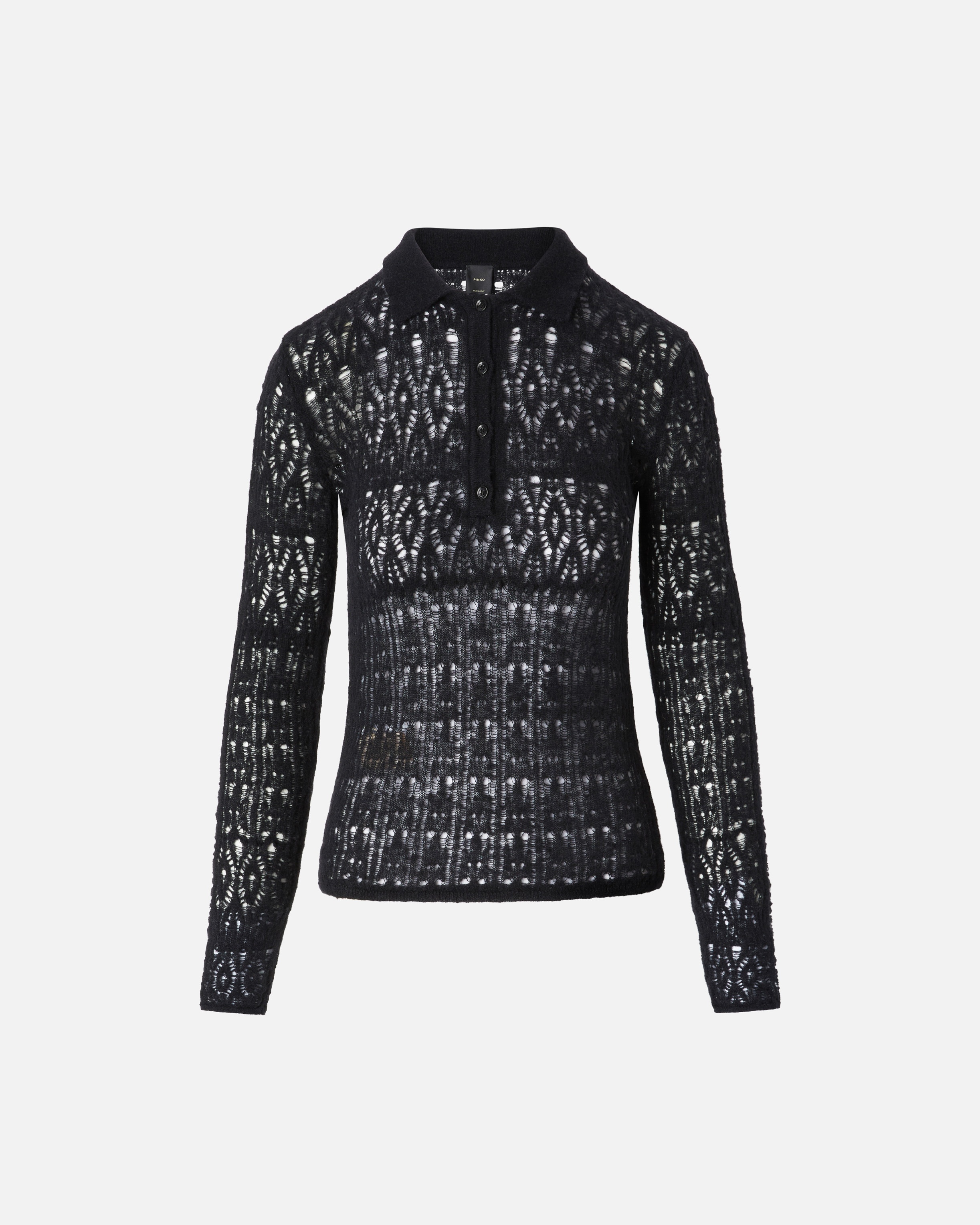 PRINSLOO POLO − 105128A2L1Z99 Women's long-sleeved polo shirt made of soft wool and alpaca blend yarn worked in lace stitch, characterised by a weave that recreates the perforated and semi-transparent effect of lace. The close-fitting knit is completed by the classic polo collar with a half-buttoning on the front. The polo shirt is the new under-jacket, to be worn with a suit for an extra feminine touch to your formal looks. COMPOSITION : POLYAMIDE 45% POLYAMMIDE 45% ALPACA 30% WOOL 25%