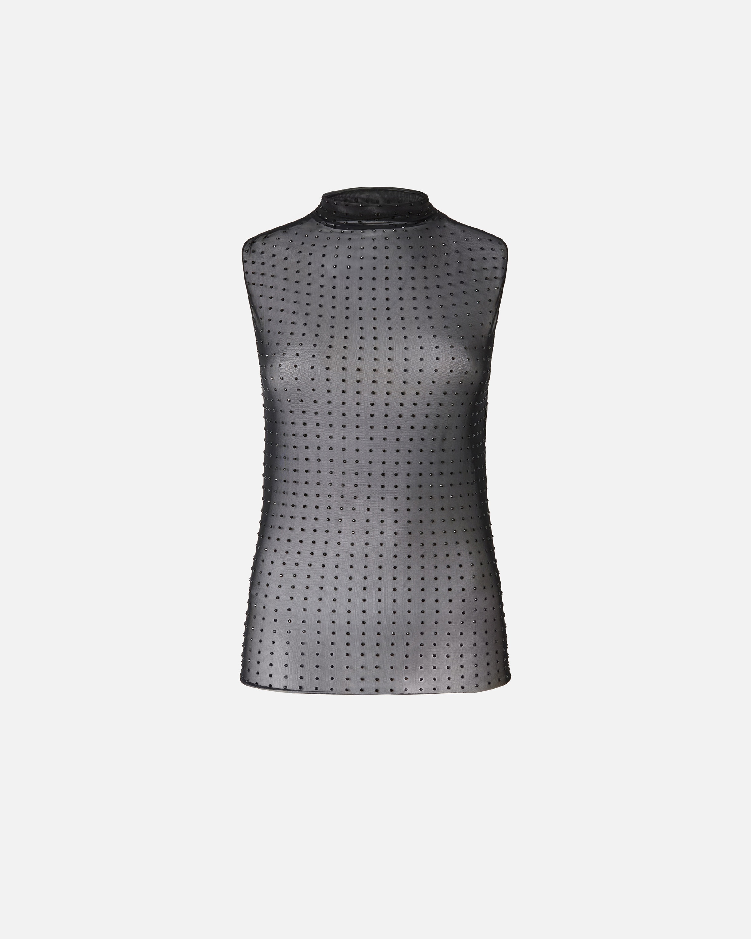 LARUNS TOP − 103913A220Z99 Sleeveless top in light, transparent tulle with slightly raised collar and sparkling, matching-colour rhinestones all over. COMPOSITION Outside Fabric: POLYAMIDE 82% POLYAMMIDE 82% ELASTANE 18% - Accessory: Glass 100%