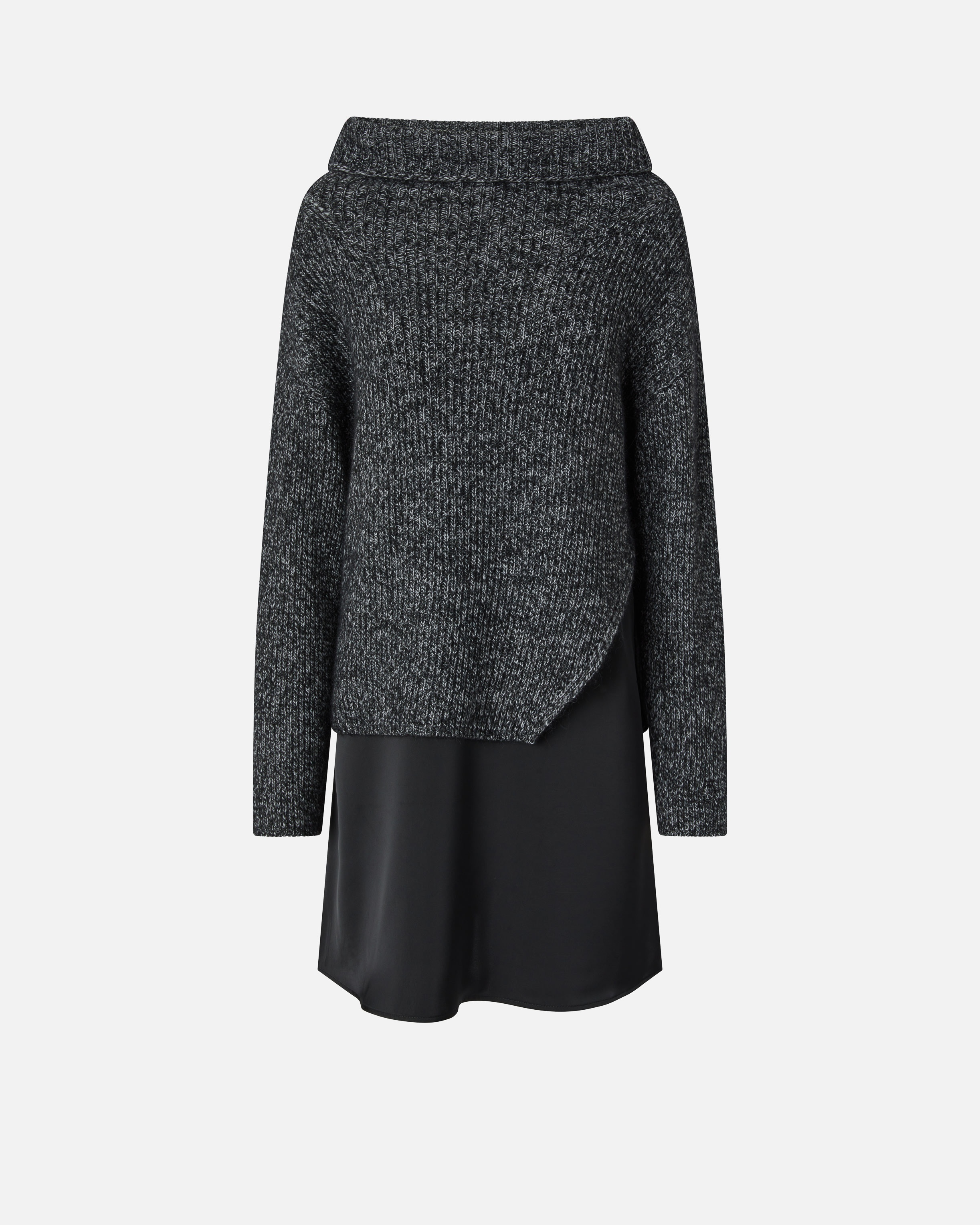 ETEREO DRESS − 104116A247KZZ Dual-fabric mini dress made with upper part of wool-alpaca blend ribbed mouline knit, featuring a twisted yarn. The long-sleeved funnel neck sweater is complete with an asymmetrical slit at the hem and matching shiny fabric lining, which creates the effect of the dress. An original daytime outfit, perfect to wear for all occasions. COMPOSITION Outside Fabric: WOOL 43% POLYAMMIDE 34% POLYAMIDE 34% ALPACA 23% - Lining: POLYESTER 100%