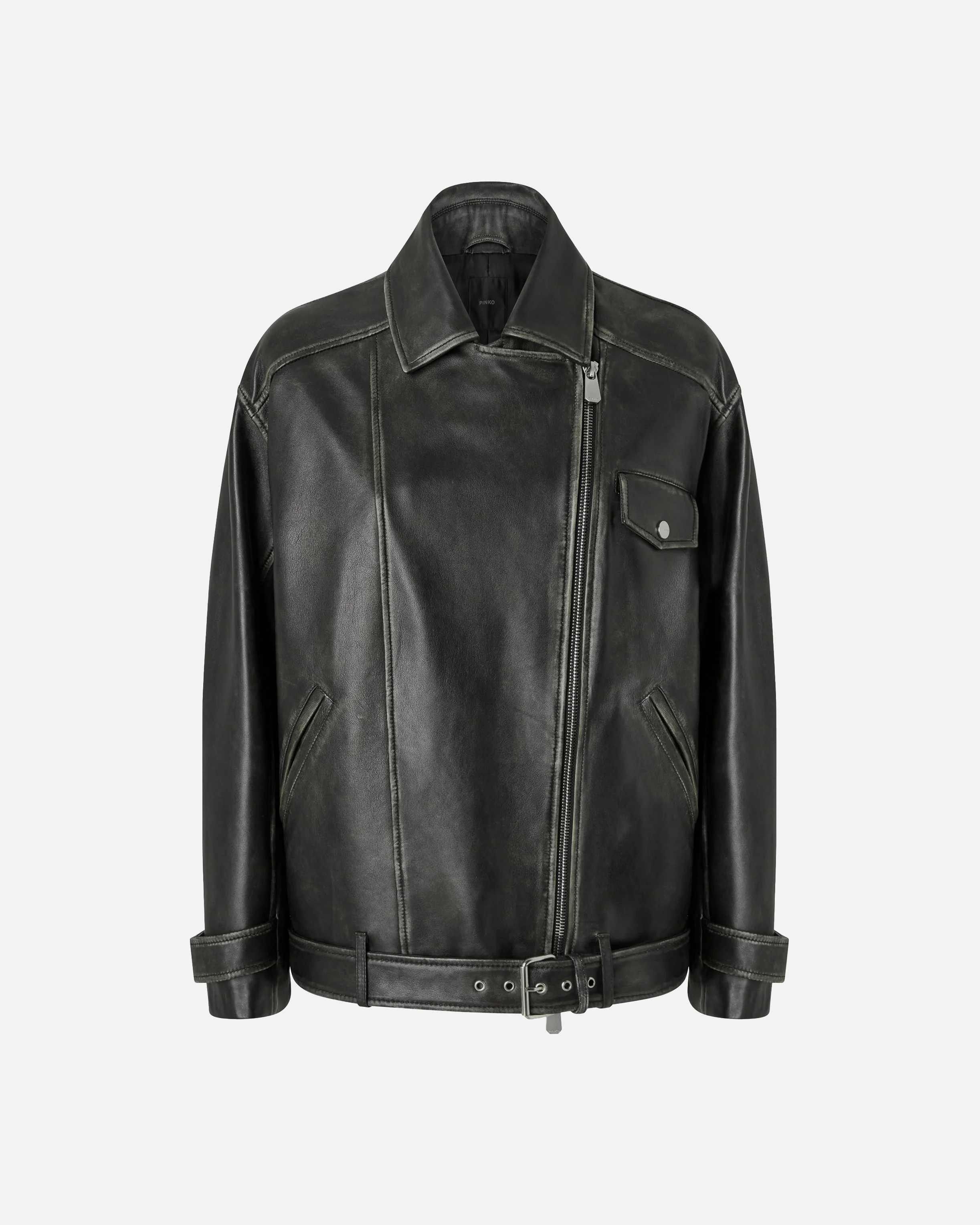 CACIOPEPE BIKER JACKET − 105369A23UZ98 Biker jacket with a shirt collar, adjustable fastenings on the cuffs, slanted pockets and a flap breast pocket with press stud. This piece is available in a leather version with an eye-catching distressed effect, obtained through a special dyeing and finishing process. Buckled belt at the bottom of the garment, which can be worn open or closed. Off-centre zip fastening. This outerwear jacket offers a fresh, modern take on the classic leather biker jacket, with a slightly more relaxed and less structured fit, making it ideal to pair with everyday looks and elevate them with style. COMPOSITION Lining: POLYESTER 100% - Leather: SHEEP LEATHER 100% SHEEPSKIN LEATHER 100%