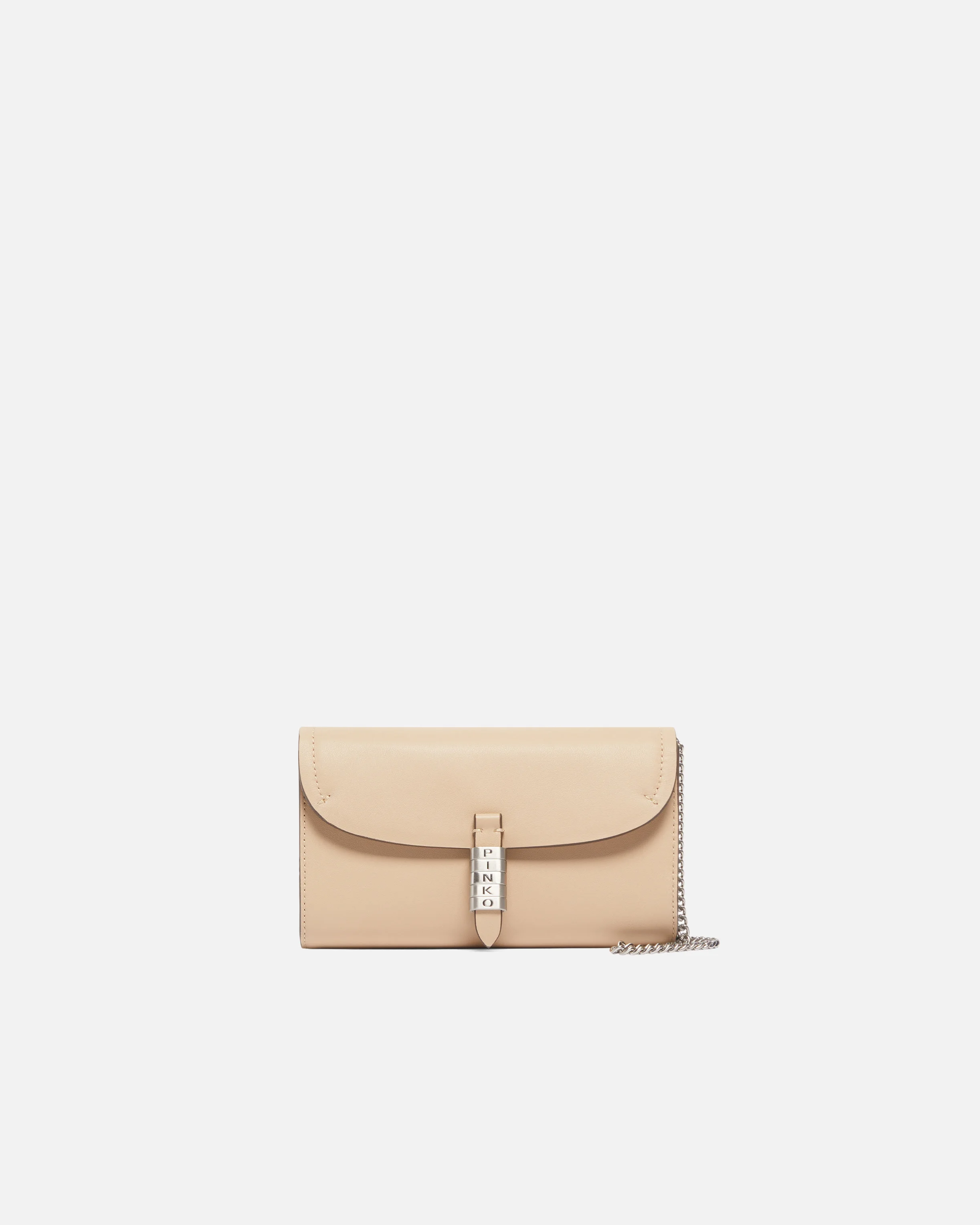 SADDLE WALLET CHAIN − 105348A1ZXC50E00001 Rectangular leather purse featuring a soft feel, a cotton lining and a slim, removable chain shoulder strap. The design is complemented by the PINKO lettering logo built with the metal hardware that completes the flap fastening and which embodies the inimitable style of the brand. The accessory is complemented by a zip fastening and various wall pockets to organise your essentials in style. Activate your PINKO accessory: verify the authenticity of your product and access a personalised experience by scanning the Love Birds embroidery on the back with your smartphone! COMPOSITION Leather: COWHIDE 100% BOVINE SKIN 100% - Outside Fabric: POLYAMMIDE 100% POLYAMIDE 100% - coating: POLYURETHANE 100% - Lining: COTTON 100% MEASUREMENTS - Height: 11 cm - Width: 5 cm - Length: 19 cm
