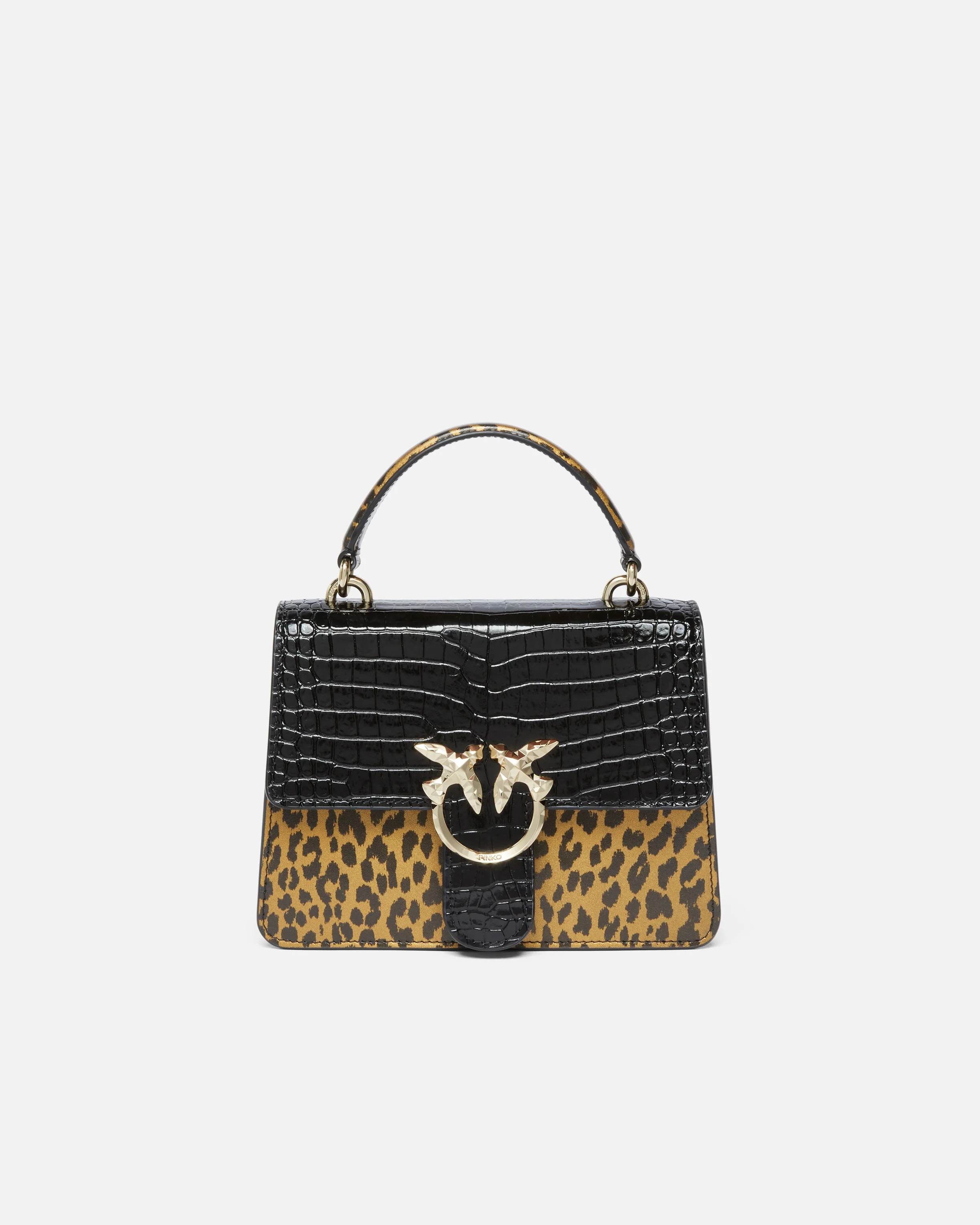 LOVE ONE TOP-HANDLE MINI LIGHT − 100071A28QZH2L00001 Small glossy leather crossbody bag with a crocodile print, smooth leather details and a two-tone spotted animal print. This trapezium-shaped handbag features a semi-rigid structure, with a top handle for hand carrying and a detachable shoulder strap that combines the classic metal chain with a practical, adjustable leather pad, so you can carry it two ways. The bag boasts a fabric-lined interior, complete with practical zipped centre divider pocket for better organisation of the space. The magnetic flap fastening is complemented by the iconic metal Love Birds Diamond Cut buckle embellished with a distinctive faceted effect. The bag is part of the Limited Edition special capsule collection which comprises PINKO Galleria-exclusive limited-edition models. Use the special NFC chip to enjoy a special experience, specific to the bag you have just bagged! COMPOSITION Leather: CALF LEATHER 100% CALFSKIN LEATHER 100% - Leather: CALF LEATHER 100% CALFSKIN LEATHER 100% - Lining: VISCOSE 100% MEASUREMENTS - Height: 22 cm - Width: 7 cm - Length: 20 cm