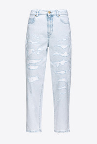 Five-pocket mom-fit jeans in very light-coloured snow-washed denim, with rips and tears on the front and on the rear pockets. High waist with belt loops and straight legs that are slightly tighter at the bottom. Metal zip and tack-button fastening. COMPOSITION Outside Fabric: COTTON 96% ELASTOMULTIESTER 4% - Lining: POLYESTER 65% COTTON 35%