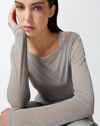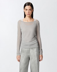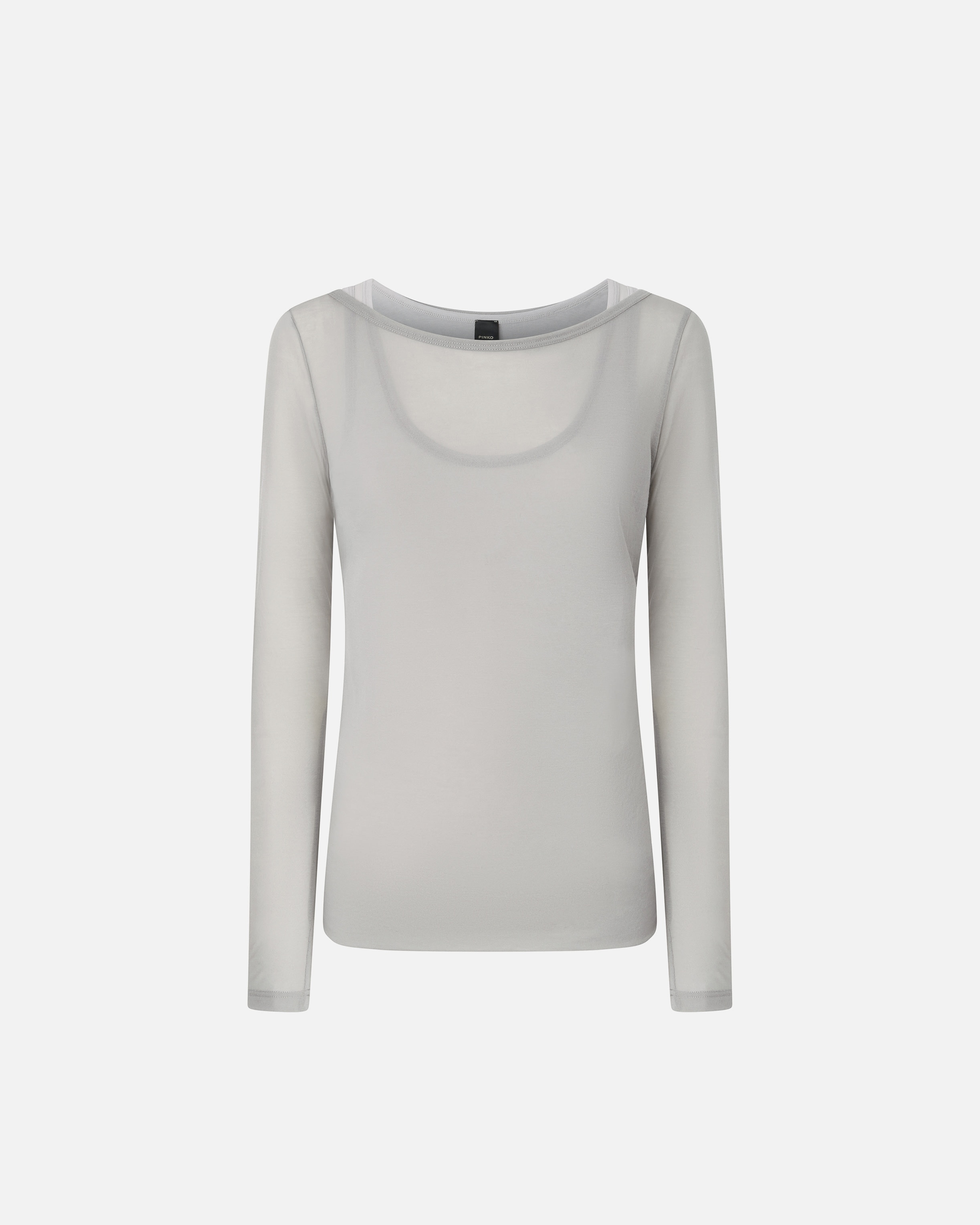 GOODS MESH − 104653A2CLIIA Women's long-sleeved women's sweater in very light gauze-effect cotton blend crepe jersey, which gives the fabric a semi-transparent look; For this reason, the long-sleeved shirt comes complete with a tank top that you can wear underneath to soften its transparency and achieve a covering effect. The soft volume of the top with boat neckline and long sleeves makes it a perfect underjacket to combine with suits and suits, both for business looks and for outfits to wear in ceremonies and special occasions. COMPOSITION 1° Outside Fabric: COTTON 70% POLYAMMIDE 30% POLYAMIDE 30% - 2° Outside Fabric: COTTON 70% POLYAMMIDE 30% POLYAMIDE 30%