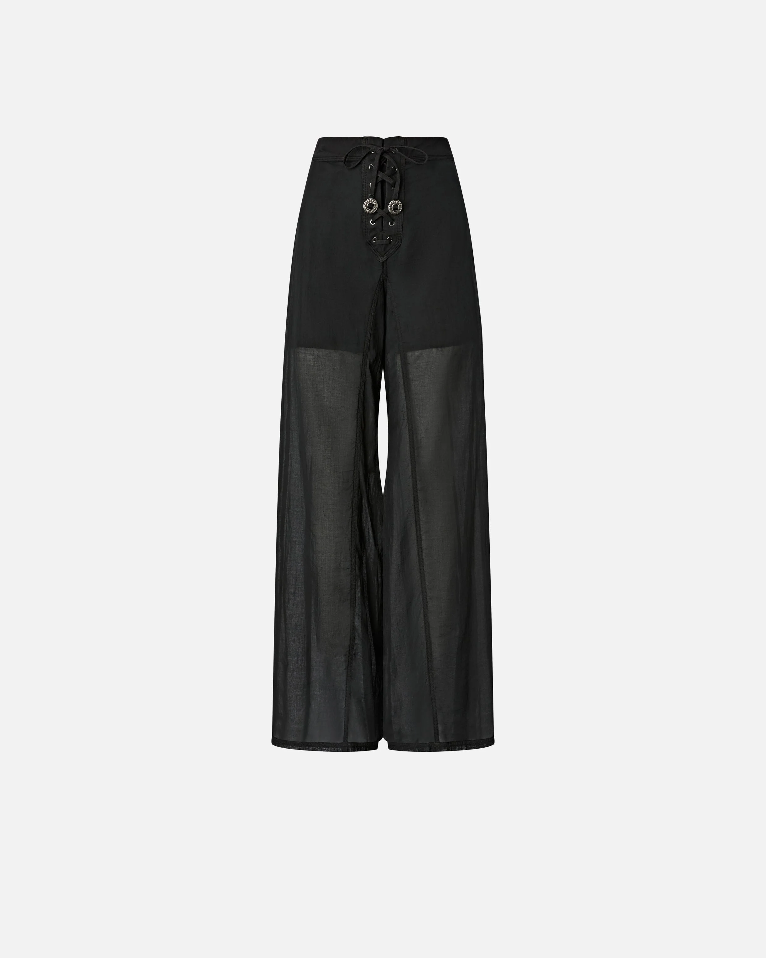 106947A3AX-Z99 Straight-leg trousers made of garment-dyed cotton and featuring a gabardine upper with a compact texture, and a very lightweight voile hem with a sheer effect. Featuring convenient side pockets, this style stands out for its front fastening with metal eyelets and crossed laces to tie as desired, complete with Texan-inspired metal ends. Wear the trousers with the matching T-shirt or top, for a summer look that leaves nothing to chance. COMPOSITION 1° Outside Fabric: COTTON 100% - 2° Outside Fabric: COTTON 100% - Lining: COTTON 100% MEASURES W: 0.37 g