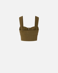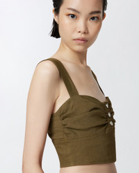 VOYAGER TOP − 104885A0IMX26 Women's sleeveless cropped top made of lightweight stretch linen blend fabric, perfect for even the hottest days. The sleeveless line of the top is finished with straps, gathered sweetheart neckline at the front completed by a row of three metal buttons at the front. The cropped cut and feminine, summery design of this top brings a fresh detail to any look you choose to pair with it. COMPOSITION Outside Fabric: LINEN 55% VISCOSE 42% ELASTANE 3%