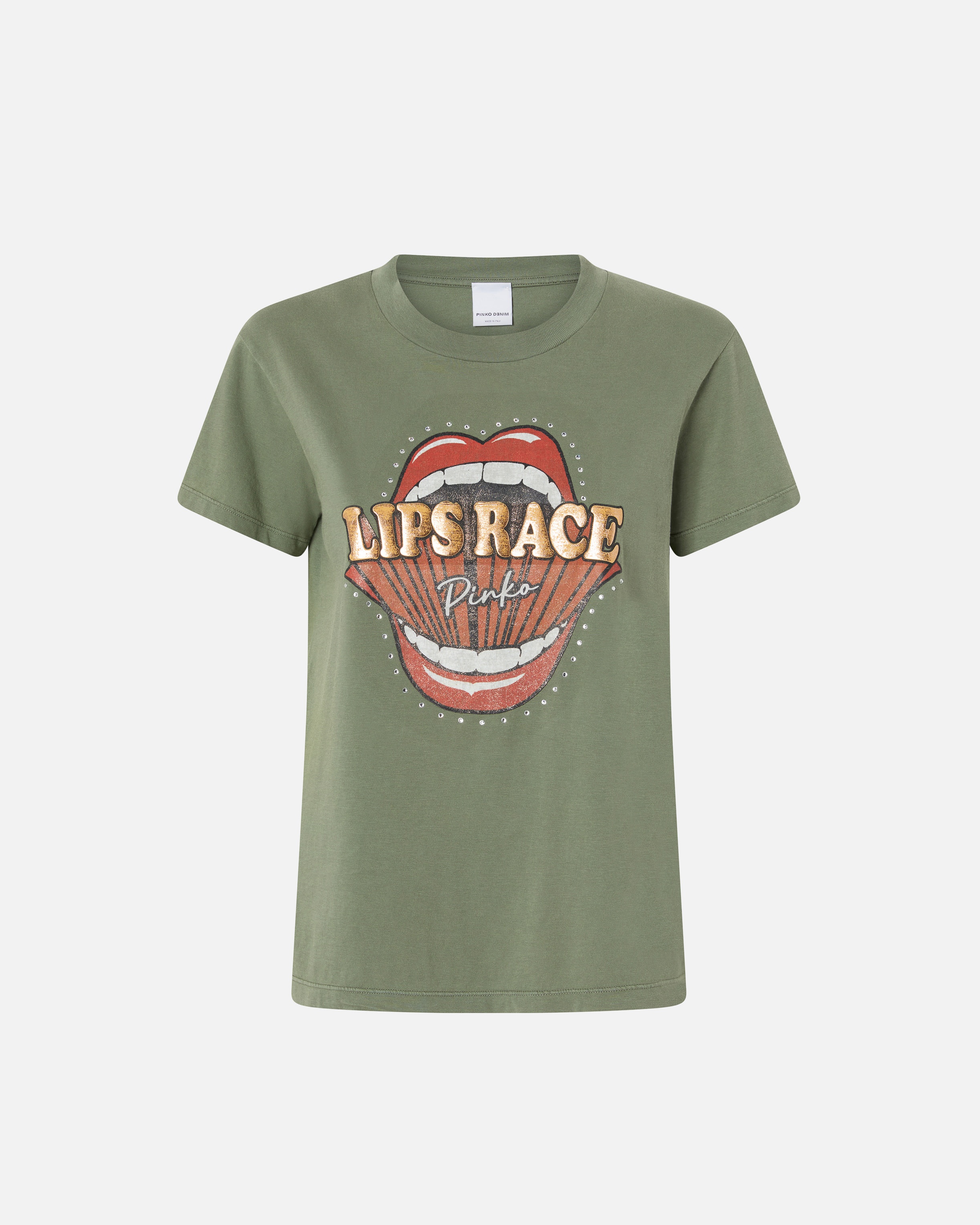 TRAPANI HIGH TRIM T-SHIRT − 105050A2D8V49 Women's short-sleeved T-shirt in old-dyed cotton jersey, with a particular vintage color effect, with a maxi print with mouth made up with lipstick and PINKO Lips Race lettering, embellished by the application of glitter on the contour of the lips. A T-shirt that combines pop inspiration with the brand's iconic style, to add a personal touch to your everyday outfits. COMPOSITION 1° Outside Fabric: COTTON 100% - 2° Outside Fabric: COTTON 100% - : Glass 100%