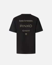 STREPITOSO T-SHIRT − 105526A2RMZ99 Pure cotton jersey T-shirt with round neck and short sleeves. The piece features shiny rhinestones that cover both the PINKO lettering logo on the front and the lettering on the back with the slogan "See breezy, PINKO easy" and our must-have Love Birds logo. This T-shirt will work seamlessly with your favourite trousers, elevating your look in a simple, elegant and original way. COMPOSITION 1° Outside Fabric: COTTON 100% - 2° Outside Fabric: COTTON 95% ELASTANE 5% - : aluminium 100% Aluminium 100%
