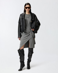 NAMIBH ABITO − 104614A2HEI63 Women's biker-style leather jacket that takes inspiration from racing imagery, with contrasting color stripes and customization with bird logo and PINKO Garage lettering, which emphasize its inspiration. The small stand-up collar is closed with a button, while the set-in sleeves are completed by a zip at the bottom of the sleeves. The biker racing jacket is characterized by a slim line, with pockets on the sides closed with zip and internal fabric lining. Metal zip closure. This leather outerwear completes your daytime looks with a gritty, original and trendy touch, creating a recognizable and iconic style. COMPOSITION 1° Outside Fabric: COTTON 100% - 2° Outside Fabric: COTTON 100% - : POLYESTER 100%