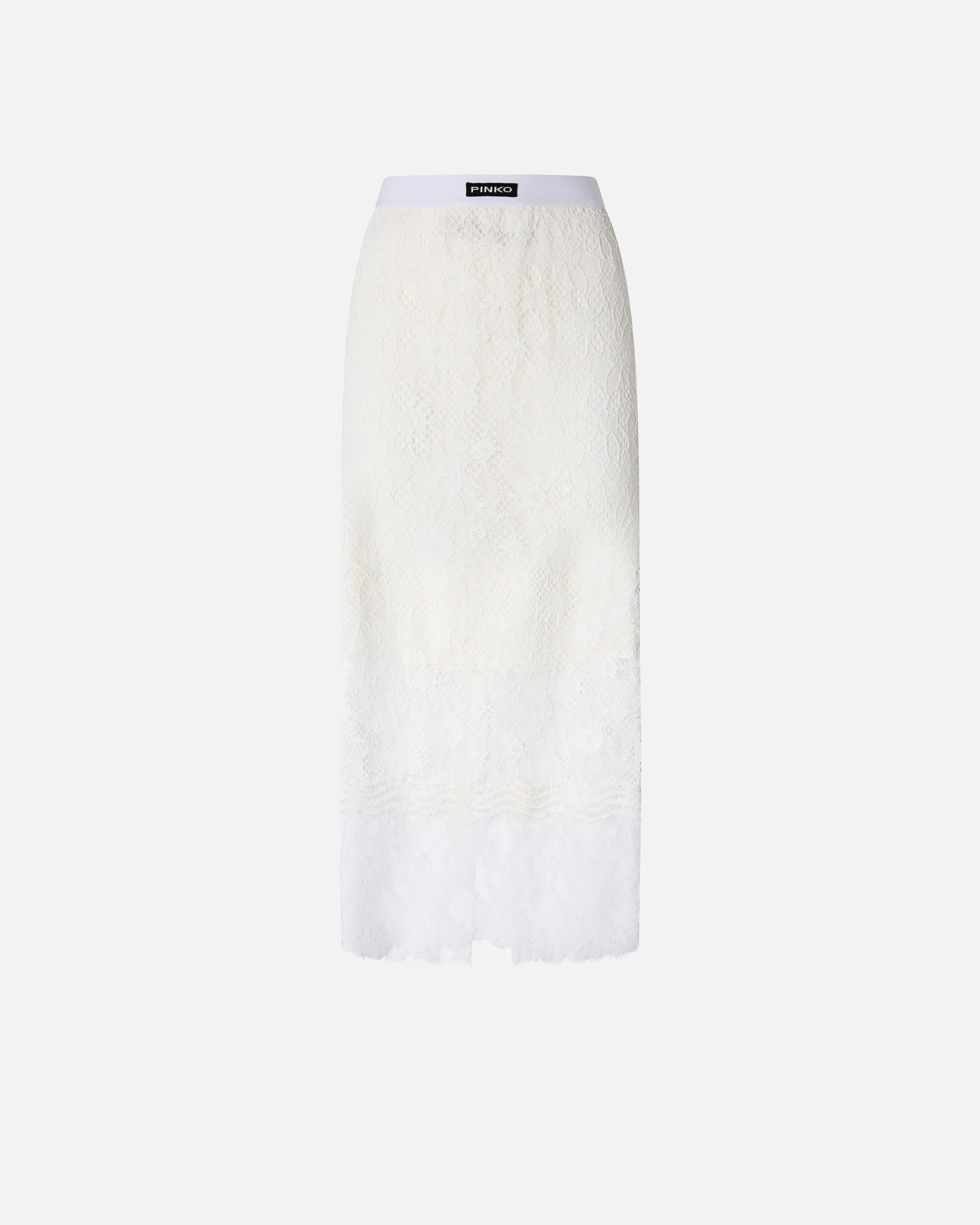 106664A381-Z05 Slim-fitting midi skirt with a comfortable waistband and elegant central front and back slits, customised with a label featuring the emblematic PINKO logo lettering on the front. Featuring a rear invisible zip to make it easier to put on and a partial lining to reduce transparency, the design is entirely decorated with an intricate mix of different types of lace, each with its own distinctive character: rebrode lace stands out for its raised, textured effect, the finer, lighter Chantilly lace finishes the trims, and the macrame lace enriches the wavy appliques on the lower section. The result is a skirt with a three-dimensional, graphic look that still retains a hint of sheer sensuality: wear it for special occasions or evening looks with the matching shirt, or pair it with a colourful crop top for a refined contrasting effect. - HARMONIE SKIRT COMPOSITION Outside Fabric: POLYESTER 100% - Lining: POLYESTER 100% - Accessory 1: COTTON 90% POLYESTER 10% - Accessory 2: POLYAMMIDE 100% POLYAMIDE 100% MEASURES W: 0.32 g