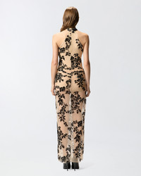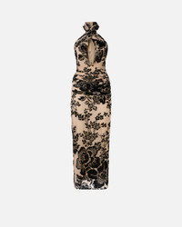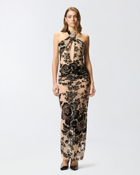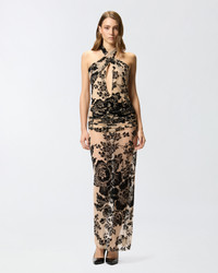 RISIKO DRESS − 105603A2QDNZ8 Long sleeveless tulle dress featuring a removable lining, a halterneck and wrap detail on the front, as well as an updated tapestry-inspired print with a modern edge. The run-resistant mesh is a very durable fabric that has undergone special treatment to prevent the stitching from unravelling when torn. The devore effect is achieved through the flock print that enhances the floral design that is rich in ramage and intricate details, creating sophisticated detailing that gives the surface depth and a feeling of three-dimensionality. The contrast between the softness of the texture and the complexity of the floral pattern creates a striking look and a refined, sensual feel. Invisible zip fastening on the back. COMPOSITION Outside Fabric: POLYAMIDE 85% POLYAMMIDE 85% ELASTANE 15% - Lining: POLYAMIDE 90% POLYAMMIDE 90% ELASTANE 10%