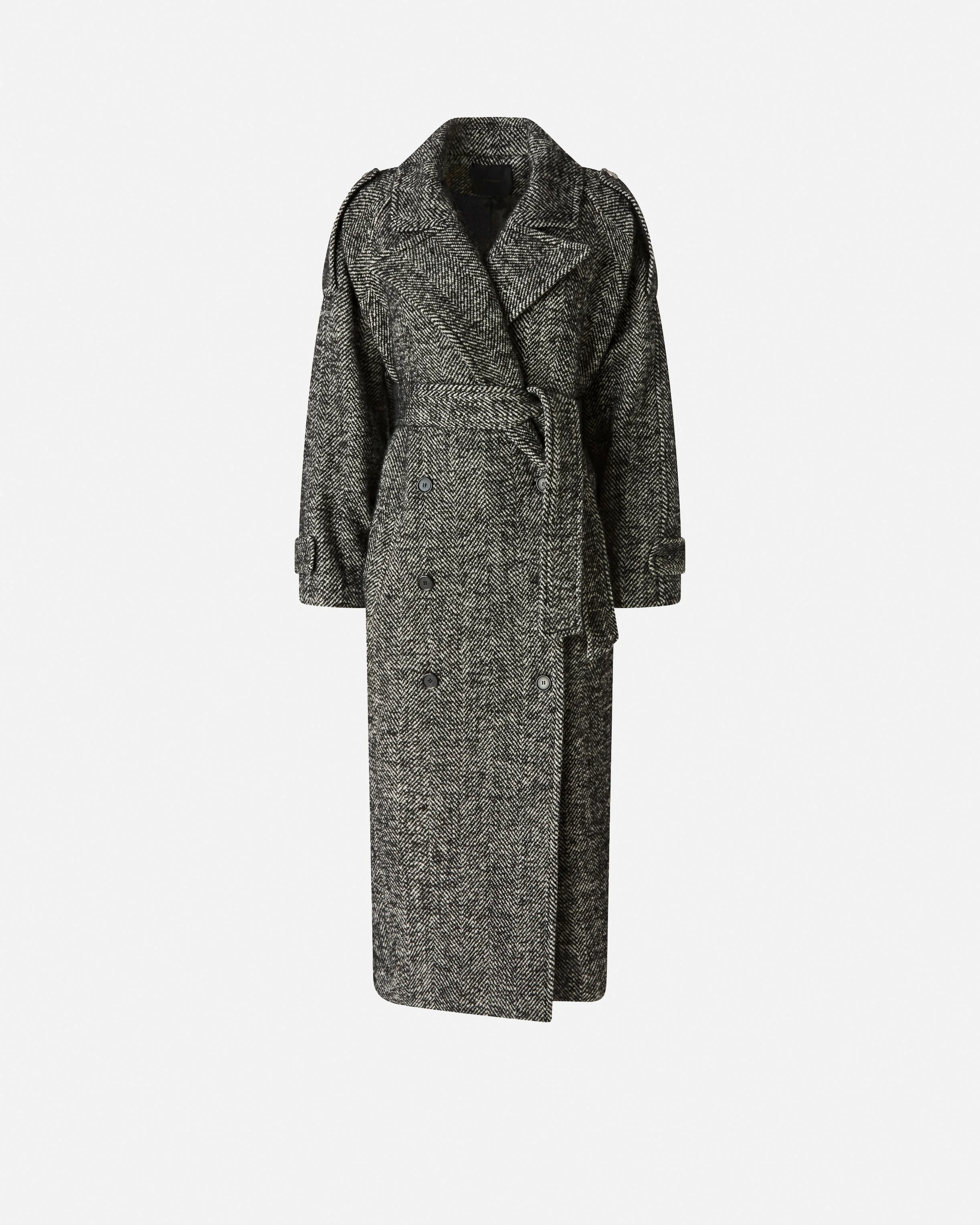 CARRUBE COAT − 105562A2SEZZ2 Women's ankle-length coat with a robe design, double-breasted fastening, lapel collar and long sleeves complete with strap details. The piece is made from warm wool-blend cloth, obtained from regenerated yarns that give the structure a textured and uneven appearance, and is customised with a refined herringbone pattern. Matching-fabric waist tie. Lined model. COMPOSITION 1° Outside Fabric: WOOL 59% POLYESTER 21% ACRYLIC 15% ALPACA 5% - 2° Outside Fabric: POLYESTER 100% - Lining: POLYESTER 50% VISCOSE 50%