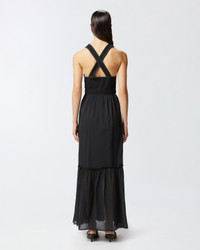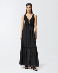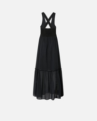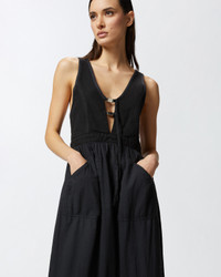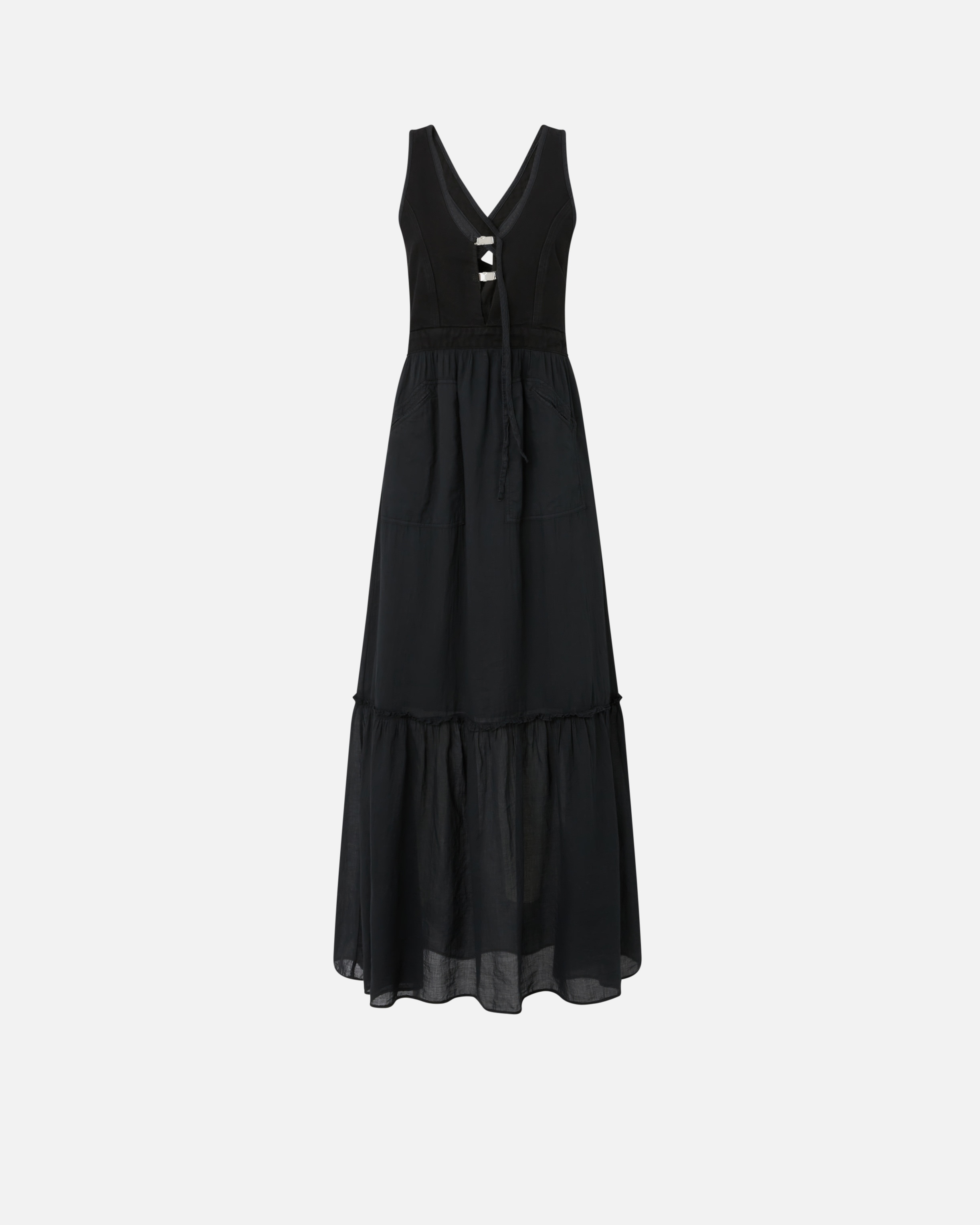 LESTER DRESS − 105254A2MIZ99 Women's sleeveless long dress in light cotton voile, a summery fabric that is fresh on the skin, with a top made of cotton canvas in the same color, which creates a contrast of textures. The sleeveless line of this day dress is complemented by a deep V-neck at the front, closed with snap hooks, and straps that cross at the back, for a feminine and unexpected detail. The long skirt of the dress is constructed with a flounce at the bottom and includes patch pockets on the hips. The original and refined details of the sleeveless cotton dress make your daytime outfit special even for everyday occasions. COMPOSITION 1° Outside Fabric: COTTON 100% - 2° Outside Fabric: COTTON 100% - Lining: COTTON 100%