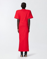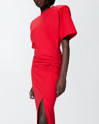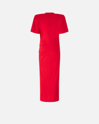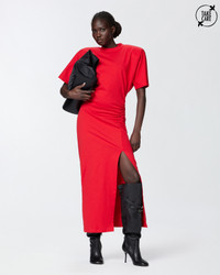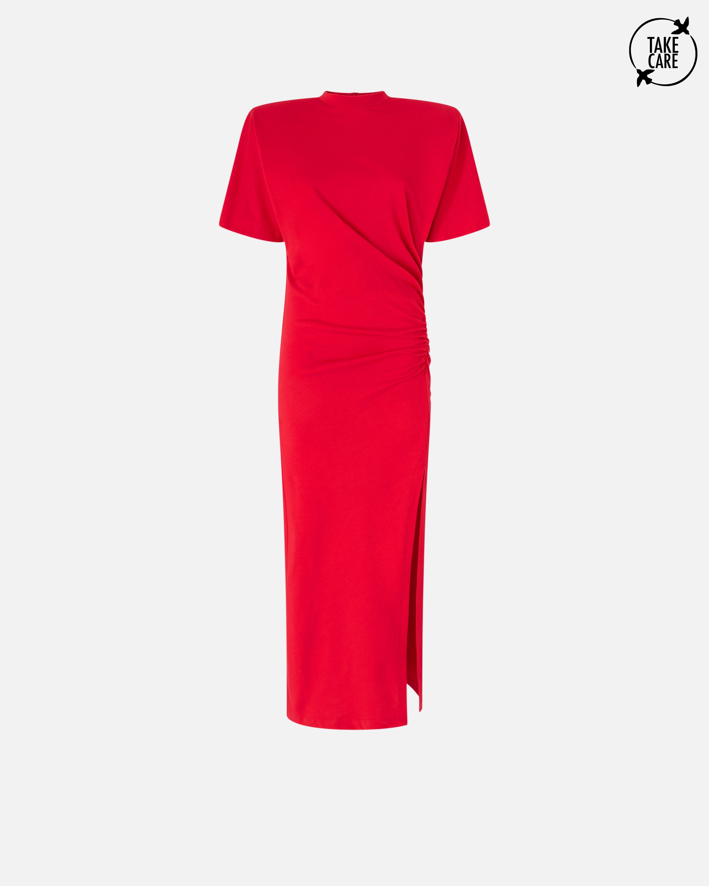 MARVIN DRESS ā 105219A2M2RA1 T-shirt silhouette dress in compact and structured jersey, made from a traceable and certified supply chain with 100% organic cotton. The long dress is characterized by short sleeves with padded shoulders that build a particular volume for the upper part of the garment. The gathered detail on one side and the side slit in front complete a dress that is already a must-wear: simple to combine, it becomes your style ally on any occasion. Elevate your daytime look with the knee-high stiletto heel boots. Invisible zip closure in the center back. COMPOSITION Outside Fabric: COTTON 100%