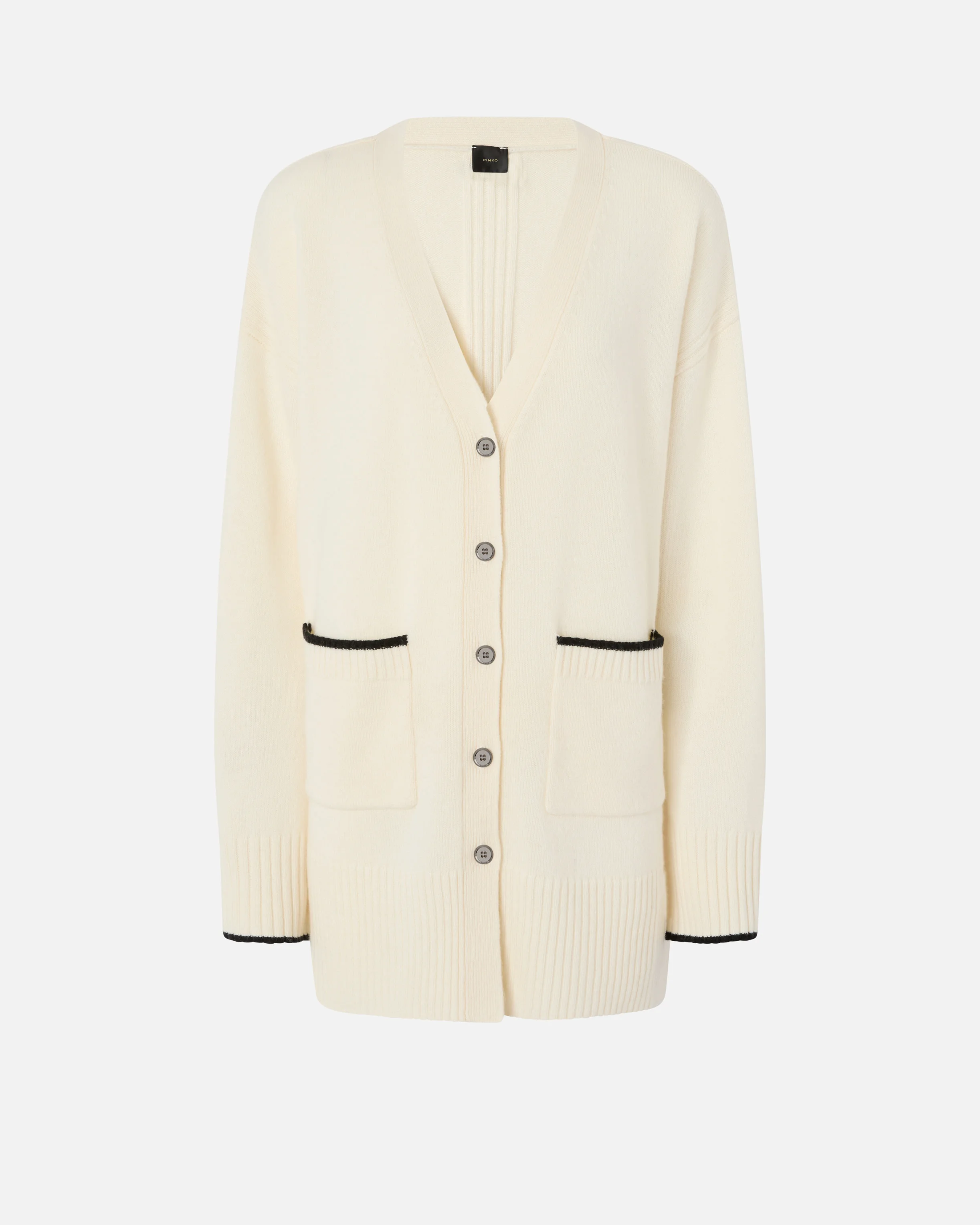 TASMANIA CARDIGAN − 105451A2Q9Z13 Long cardigan with a V-neck and dropped shoulders, made from a soft merino wool and cashmere blend, the ideal fabric for relaxing days. The contrasting yarn highlights the pockets and sleeve trims in a discreet and refined way. The piece has undergone finishing tests to minimise the possible formation of pilling, ensuring greater fabric softness and durability. The hem and cuffs are ribbed, while the final touch is given by the tone-on-tone label with PINKO lettering logo on the back of the neck. COMPOSITION Outer Yarn: WOOL 90% CASHMERE 10%