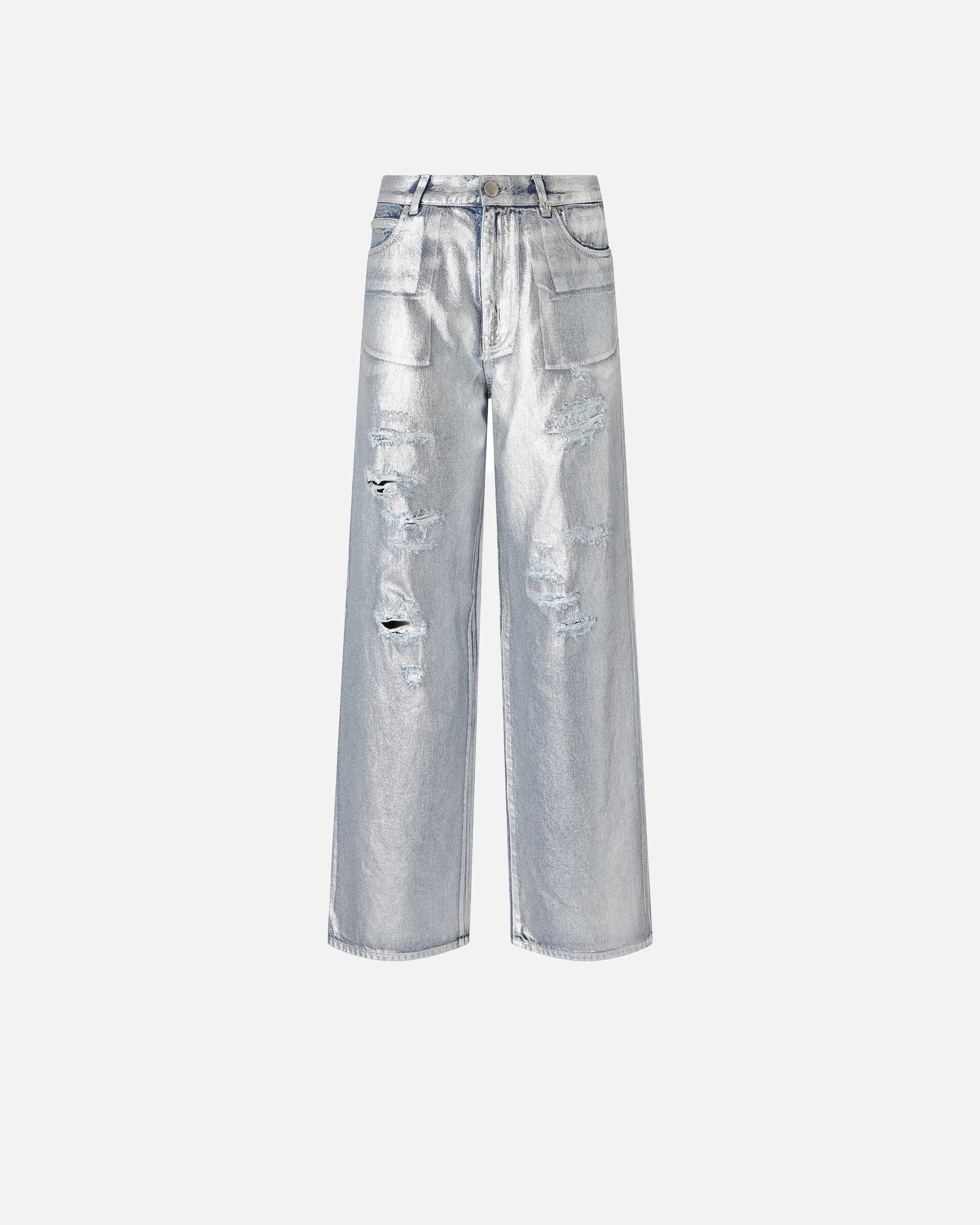 LAURYN LOOSE − 104601A2RTGU9 Loose-fit five-pocket jeans with a dropped crotch and low-rise waist made from slouchy lyocell and cotton denim for greater fluidity. This piece has localised rips and mends and a contrasting interior, but it stands out above all for its shiny and attractive metallic effect, given by a silver-tone laminated print that is applied to the finished garment to give it a three-dimensional look. The lettering logo embroidered on the back of the waistband and the detachable belt loop with Love Birds logo add pure PINKO style to the design. Belt loops and front concealed zip and button fastening. This model is a little wider than the usual size. COMPOSITION Outside Fabric: COTTON 77% LYOCELL 23% - Lining: POLYESTER 65% COTTON 35%