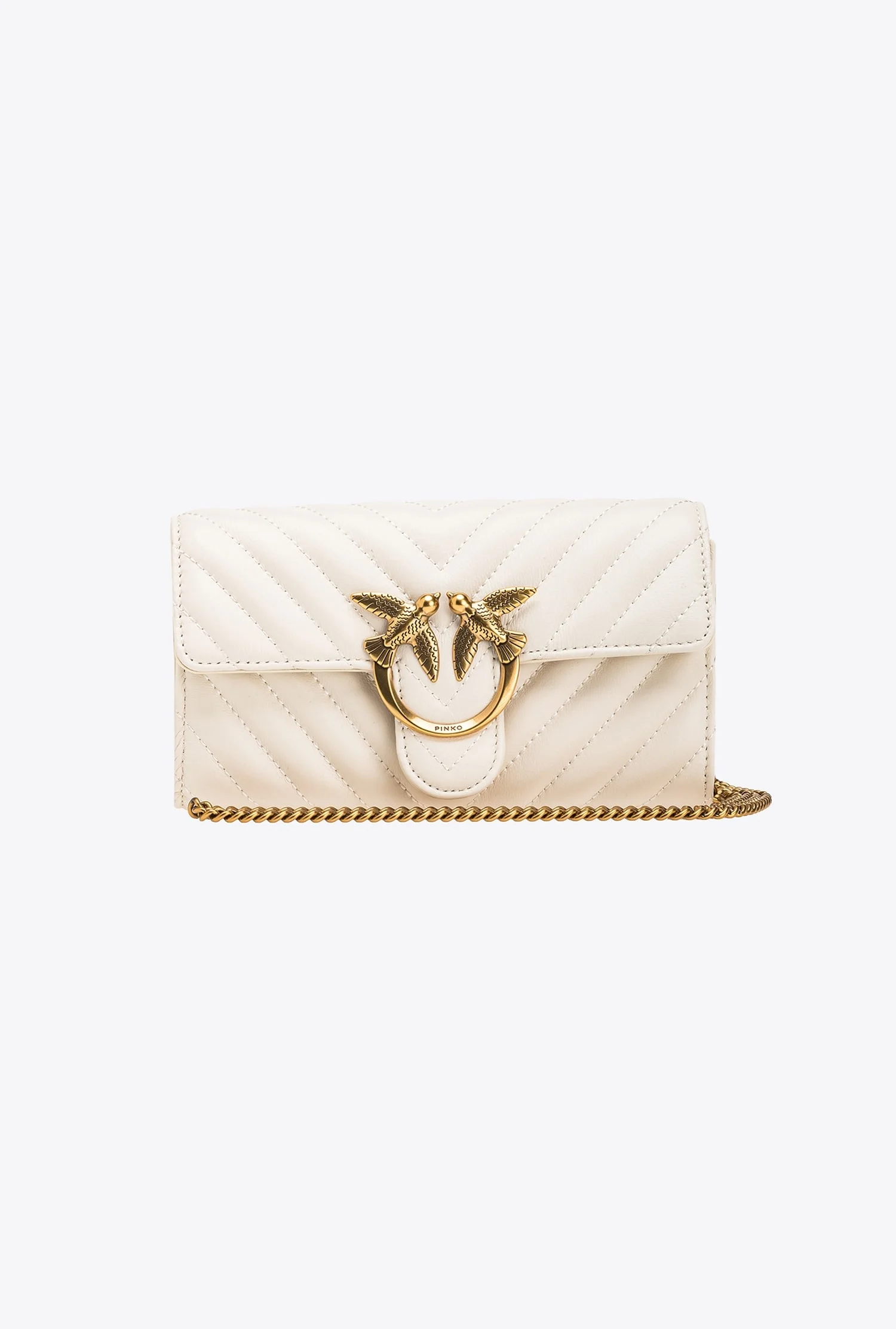 LOVE ONE WALLET C − 100062A0GKZ14Q00001 Quilted nappa leather Love Bag purse with chevron design and shoulder strap. The concealed-button fastening is embellished by the iconic Love Birds Diamond Cut buckle. The polycotton-lined interior is divided into four compartments, one of which is zipped and two of which have card slots. The removable, round-link metal-chain shoulder strap allows you to wear the purse like a crossbody bag. COMPOSITION Leather: SHEEP LEATHER 100% SHEEPSKIN LEATHER 100% - Leather: COWHIDE 100% BOVINE SKIN 100% - Outside Fabric: POLYAMMIDE 100% POLYAMIDE 100% - coating: POLYURETHANE 100% - Lining: POLYESTER 100% MEASUREMENTS - Height: 11 cm - Width: 6 cm - Length: 19 cm