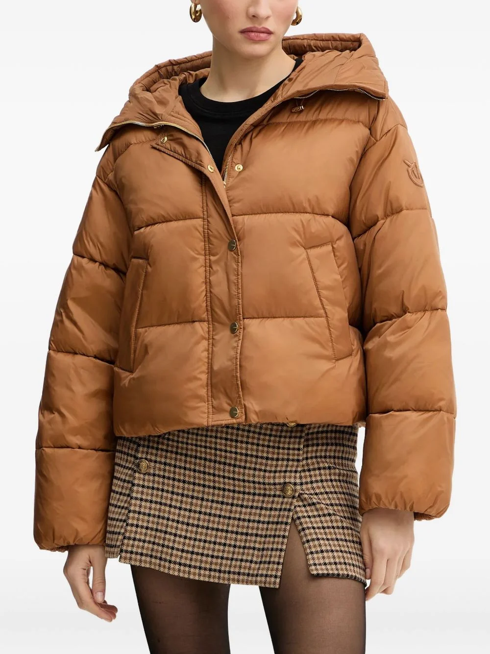Love Birds-applique padded puffer jacket Highlights - Light brown - Quilted design - Drawstring hood - Front press-stud and zip fastening - Love birds applique detail Imported Composition Polyester 100% Outer: Nylon 100% Lining: Nylon 50%, Polyester 50% Washing instructions Read Manufacturer Guidelines