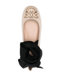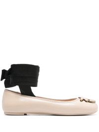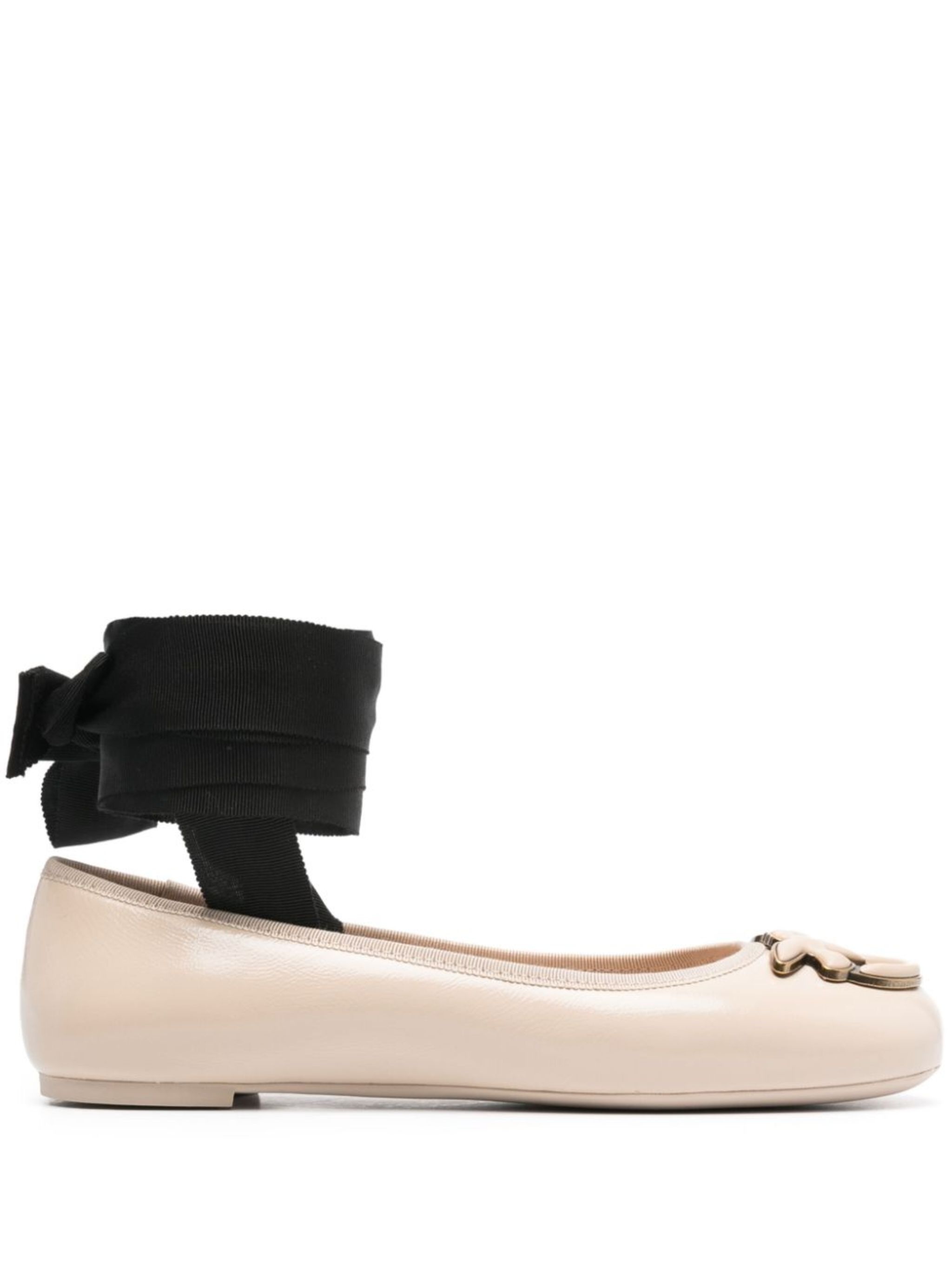 light beige calf leather grained texture almond toe signature Love Birds buckle branded leather insole leather lining low stacked heel rubber outsole antique-effect hardware tie-fastening ankle strap This piece comes complete with a protective dust bag. Size & Fit Model Measurements: Bust: 0cm Height: 0cm Hips: 0cm Waist: 0cm HEEL: 1cm Fabric and Care Designer Style ID: SD0111P043 Designer Colour: W4E NUDE Composition: Sole: Rubber 100%; Outer: Fabric 100%, Patent calf leather 100%; Lining: Fabric 100%, Calf leather 100%