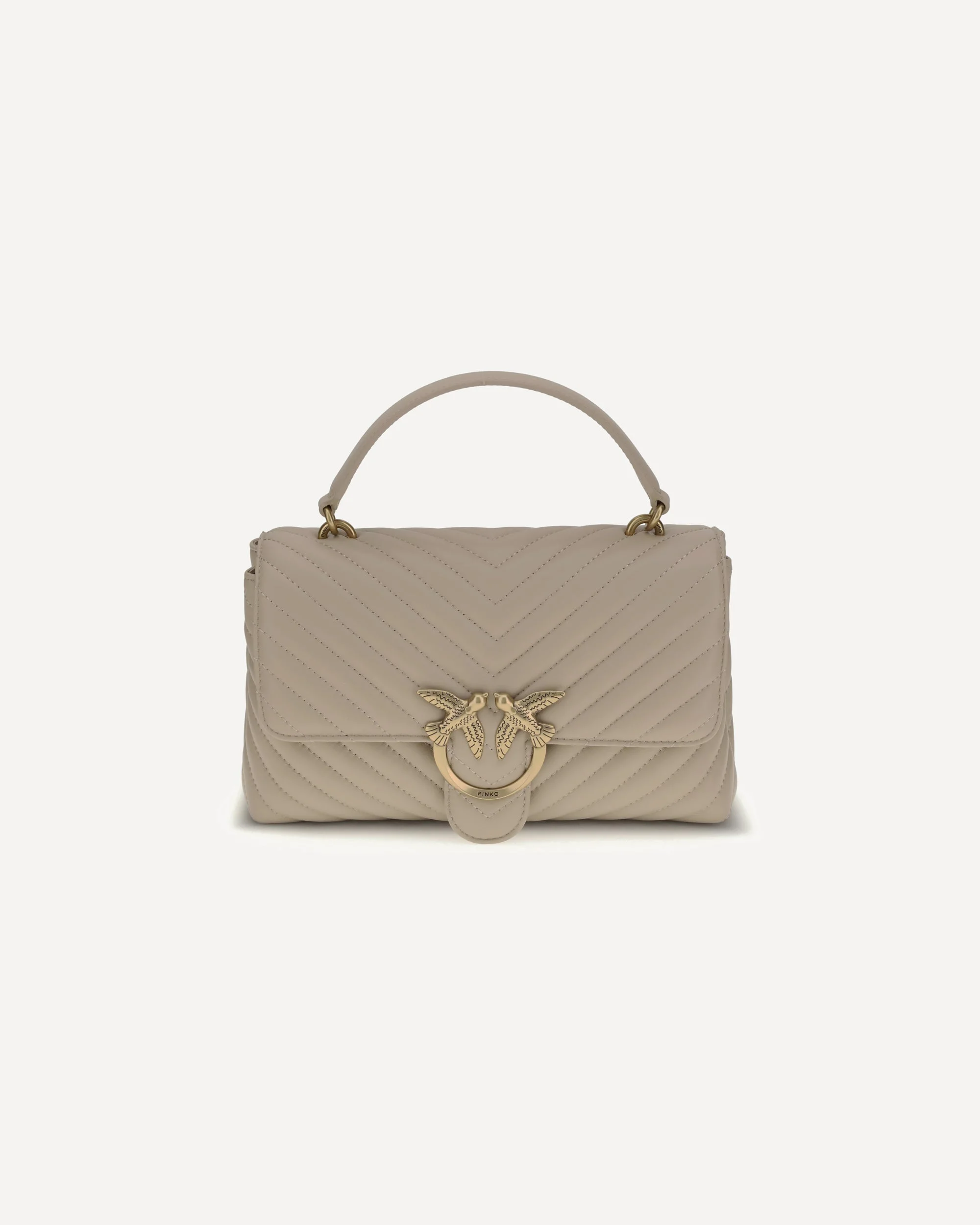 Calfskin Love Lady Handbag by Pinko, front magnetic button closure, iconic gold-plated and embossed Love Birds logo on front, quilted and padded design, double interior compartment, sliding chain shoulder strap, flat rigid handle at top, interior flat pocket with zipper, iconic tone-on-tone embroidered brand monogram on back. DETAILS - Sku: 100043A0GK_C50Q - Season: AW25 - Dimension: 27x27x7 - Composition: GENERAL 100% Calf Leather Bos Taurus - MADE IN CHINA