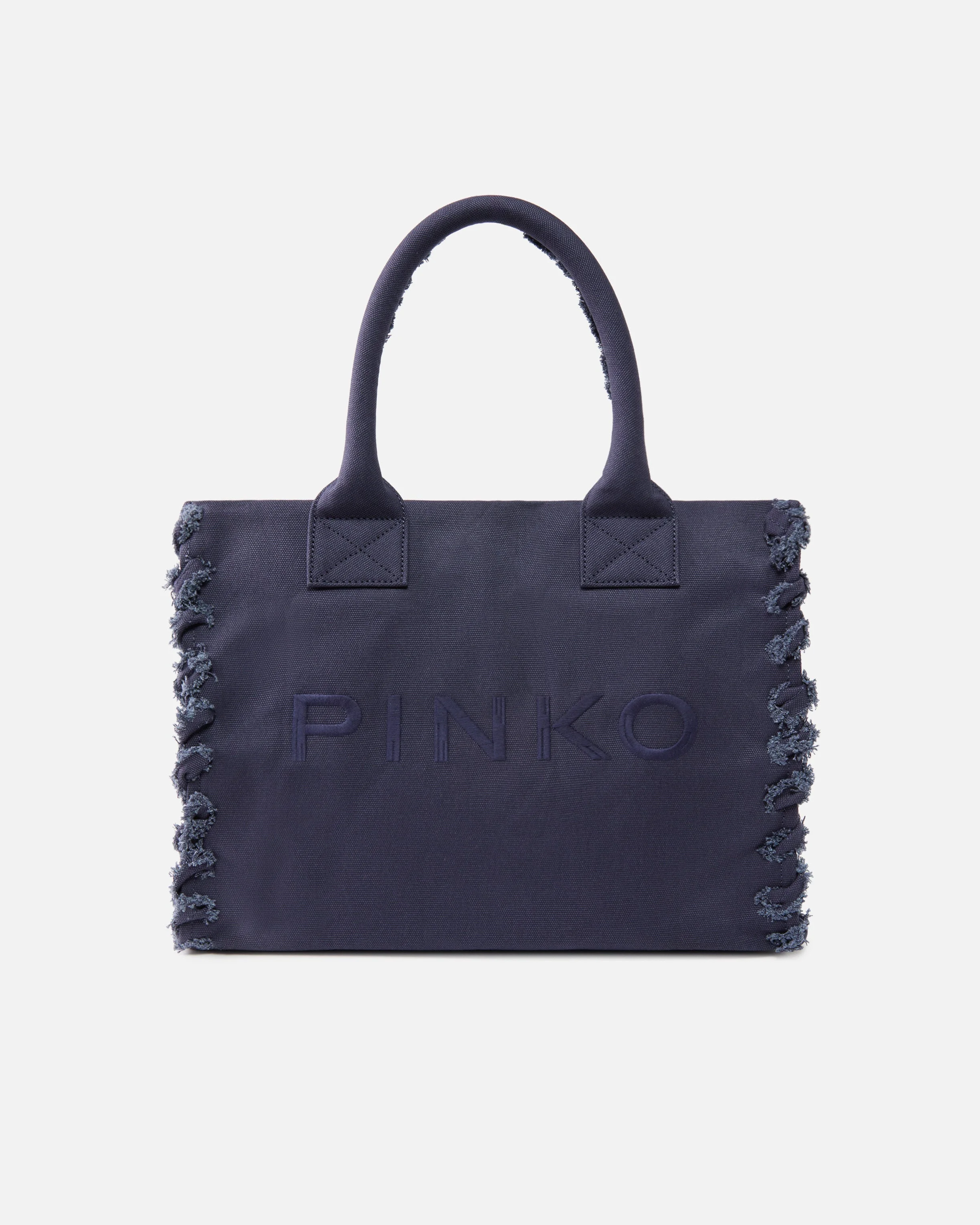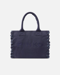 106673A3A4-J05 Medium-sized Beach shopping tote with slightly elongated rectangular shape, made from canvas and customised with tonal PINKO logo lettering embroidered on the front. This model, perfect to use as a beach bag, is enhanced by a twisted and slightly frayed-effect embellishment on the side edges, and features a top handle with frayed inner edges for hand or shoulder carry. The zip fastening opens to reveal a cotton drill-lined interior featuring a convenient slip pocket. Activate your PINKO accessory: verify the authenticity of your product and access a personalised experience by scanning the Love Birds embroidery on the back with your smartphone! COMPOSITION Outside Fabric: COTTON 100% - 1° Outside Fabric: POLYAMMIDE 50% POLYAMIDE 50% POLYURETHANE 50% - Lining: POLYESTER 100% MEASURES H: 47.0 cm W: 17.0 cm L: 38.0 cm