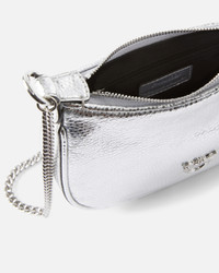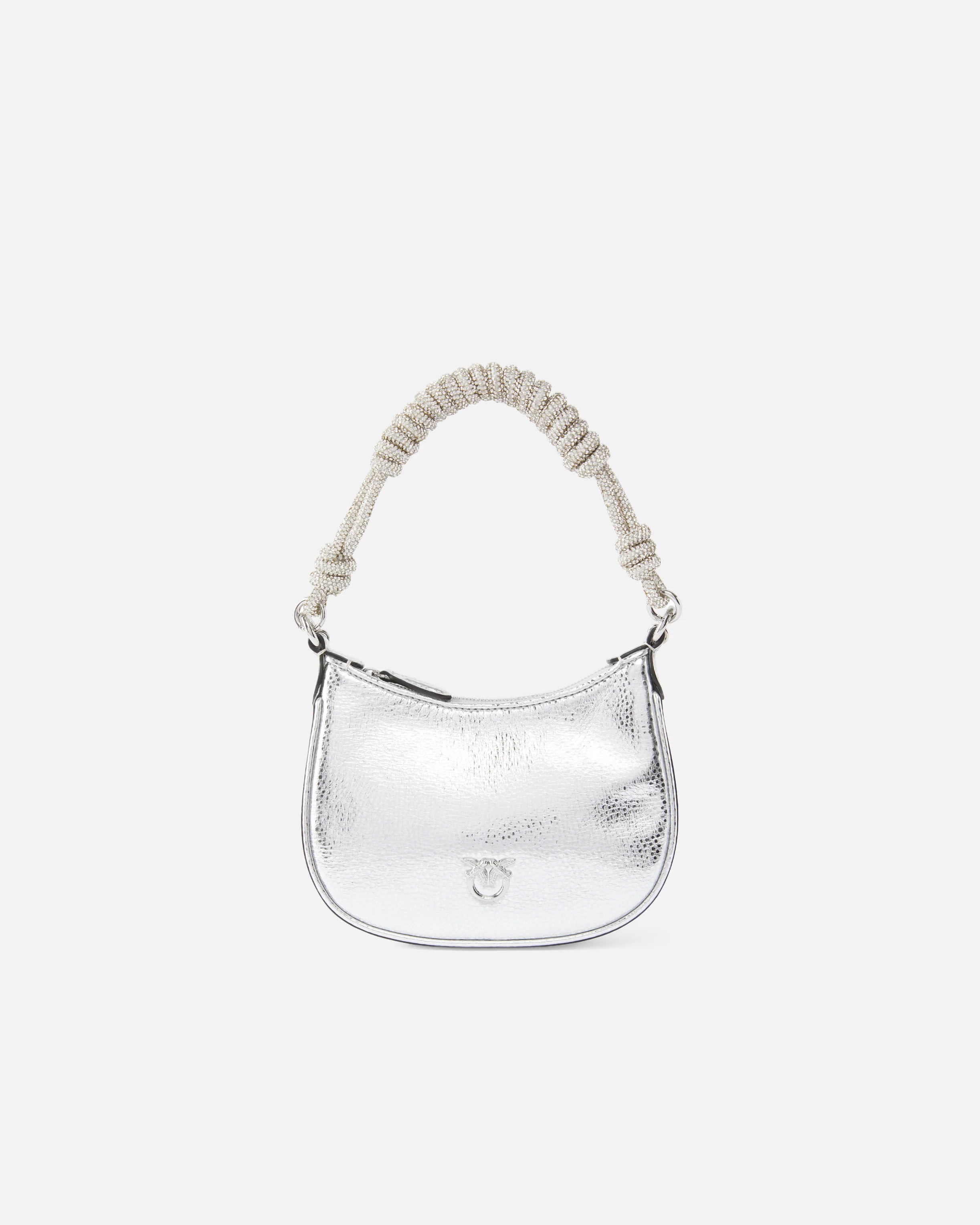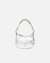 HALF MOON BABY C + HANDLE − 105913A2WDZZFN00001 Mini half-moon bag made of tumbled leather with a laminated finish, with a slightly grained texture and a reflective surface that gives a sophisticated metallic effect. The curved silhouette is enhanced by the short handle intertwined with cords embellished with micro crystals and the removable chain shoulder strap in polished metal, which allows for shoulder or crossbody wear. Top closure with a metal zip, interior lined in technical fabric with a flat pocket, tone-on-tone Love Birds logo applied to the front and edges finished with artisanal care. Compact and bright, it is perfect for adding a contemporary and feminine accent to essential day looks or for completing evening outfits with style. COMPOSITION Leather: CALF LEATHER 100% CALFSKIN LEATHER 100% - Outside Fabric: Silica 100% SILICON DIOXIDE 100% - Internal: COTTON 100% - Accessory: Zinc 100% MEASUREMENTS - Height: 13 cm - Width: 4 cm - Length: 19 cm