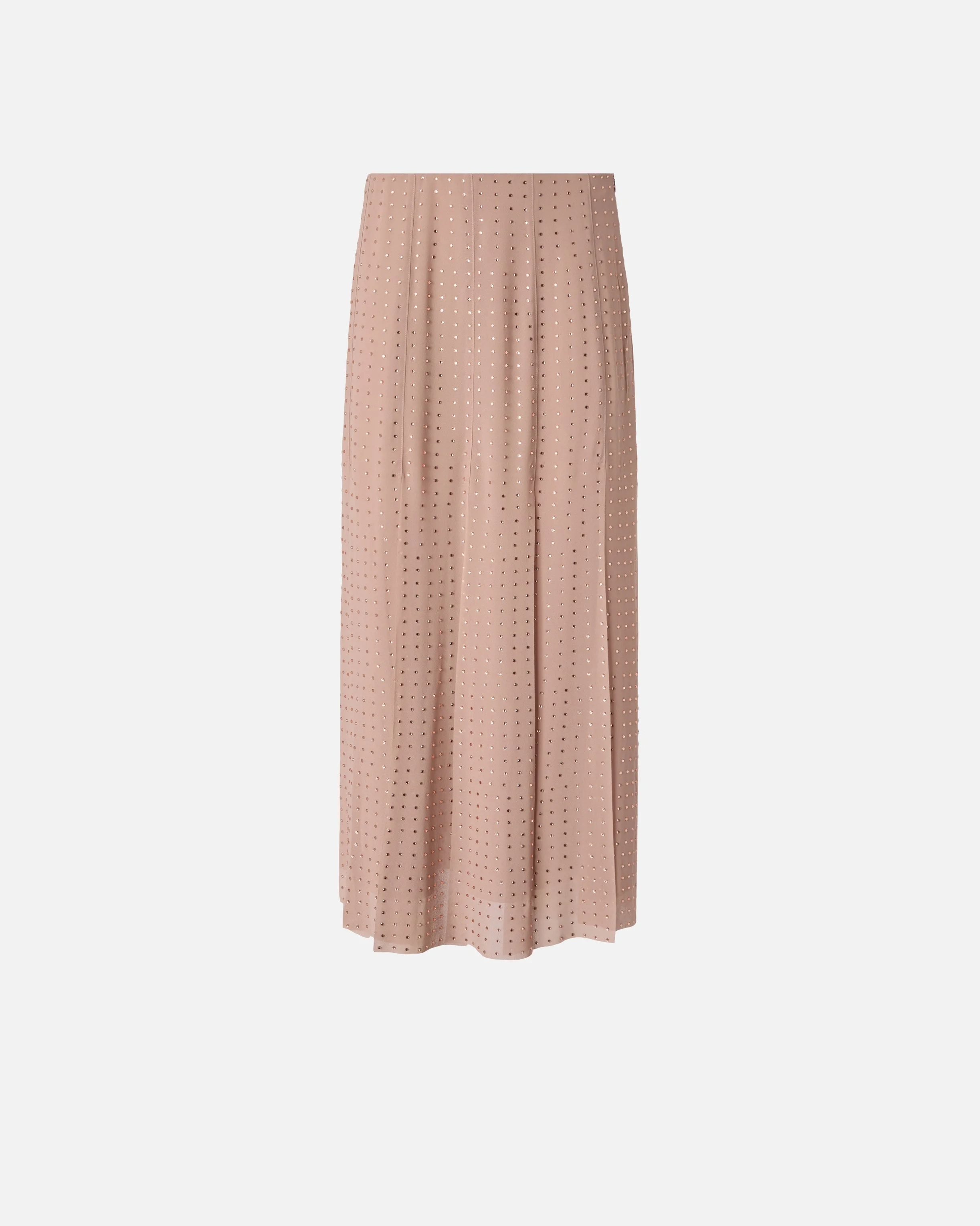 106260A32X-Q24 Midi skirt featuring unique panels at the hem that form wide fringes and create the illusion of a pleated design. Made from georgette fabric with a refined matte finish, which delicately caresses the body and delivers a light, fluid silhouette, this model is embellished with shiny rhinestones dotted all over in a way that encapsulates PINKO's DNA as a brand. The skirt, which is lined, is finished with a side fastening with invisible zip, providing a discreet functional touch without interrupting the continuity of the design. - RUCOLA SKIRT COMPOSITION Outside Fabric: POLYESTER 100% - Lining: POLYESTER 100% - : Glass 100%
