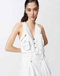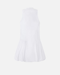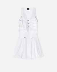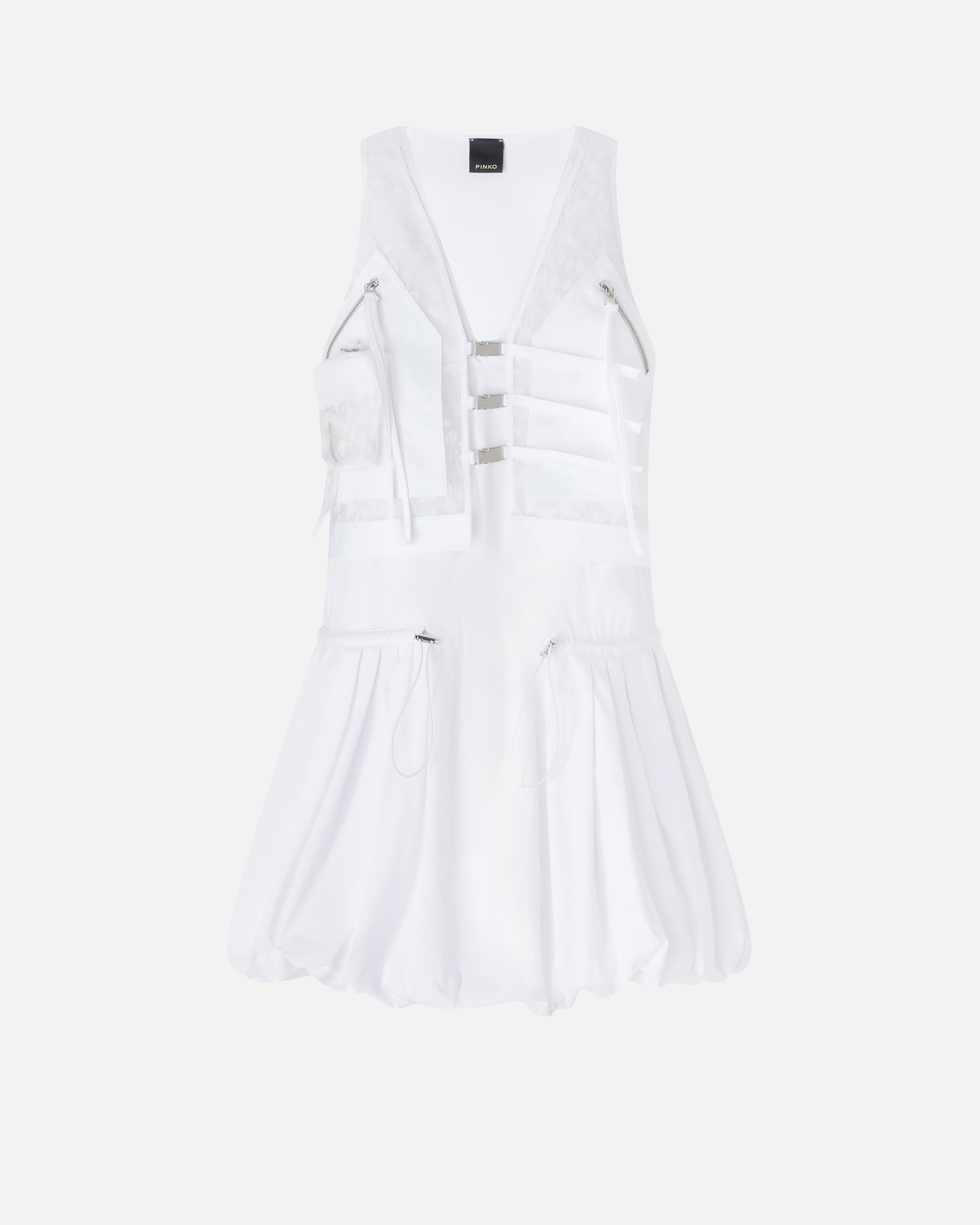 BENNY DRESS − 105305A2MOZ04 Women's sleeveless short dress made of pure cotton poplin with upper part characterized by a utility vest-style insert in light organza customized with an all-over abstract print. The sleeveless line of the mini dress is completed by a V-neckline, oblique pockets with zip and oval patch pockets on the front and drawstring at the waist, to adjust the width of the dress according to your needs. The balloon mini skirt is one of the characteristic features of this dress, with closure at the top with adjustable straps with metal snap closure. The poplin and organza dress brightens up your summer days with a special touch: combine it with a pair of slipper loafers to show it off even on everyday occasions. COMPOSITION 1° Outside Fabric: COTTON 100% - 2° Outside Fabric: POLYESTER 100% - 3° Outside Fabric: POLYESTER 100% - Lining: COTTON 100% - : COTTON 100%