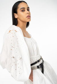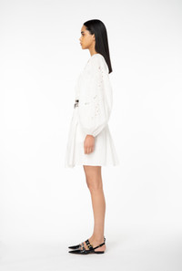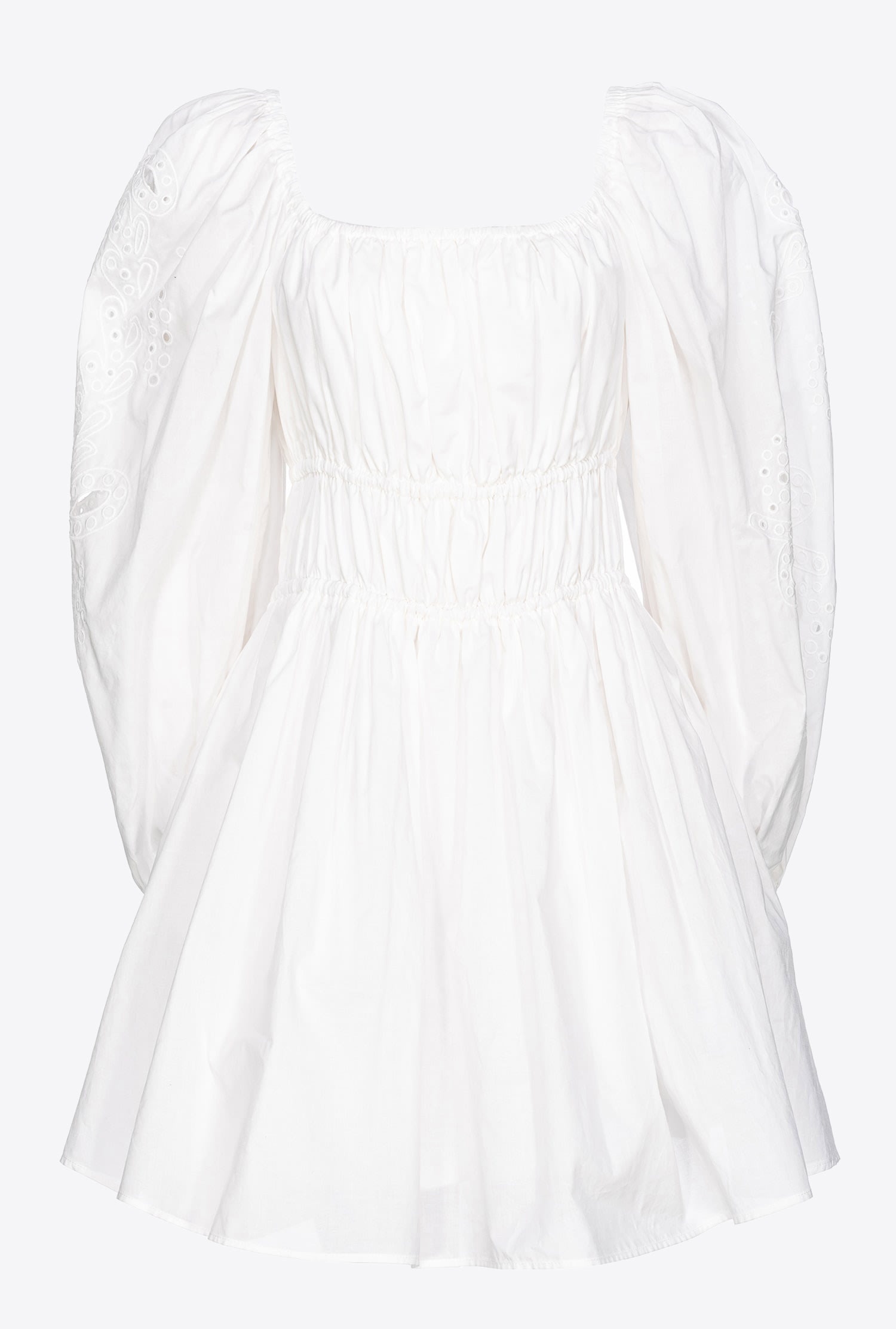 Cotton muslin mini dress with large balloon sleeves and rodeo-inspired broderie anglaise detailing. Bodice with square neck and two elastic bands and short, flared skirt with delicate pleating. COMPOSITION Outside Fabric: COTTON 100% - Lining: COTTON 100% - Material: POLYESTER 100%