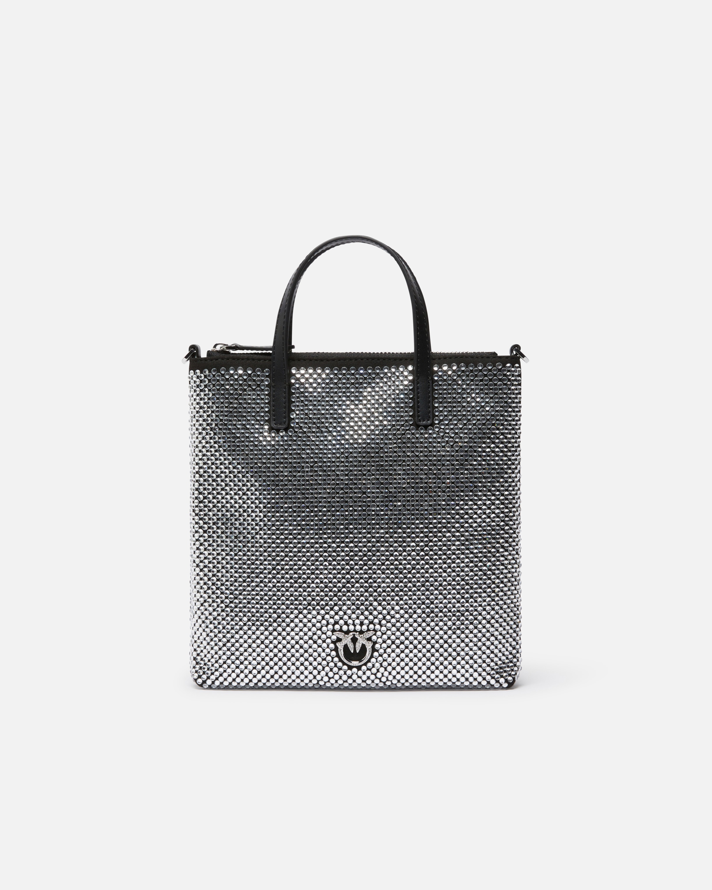 MINI SHOPPER − 102746A218Z99F00001 Shopping bag in smooth leather embellished with jewel-effect rhinestones all over and customised with a metal Love Birds Diamond Cut logo plaque with pave-set rhinestones. This small shopping bag is the ideal accessory for special-occasion looks and can be carried either by hand thanks to its two top handles, or crossbody thanks to the matching, small clasp-detachable leather shoulder strap. The bag's interior is lined with polycotton and it fastens with a zip at the top. Activate your PINKO bag: verify the authenticity of your product and access a personalised experience by scanning the Love Birds embroidery on the back of the bag with your smartphone! COMPOSITION Outside Fabric: POLYAMMIDE 50% POLYAMIDE 50% POLYURETHANE 50% - Lining: POLYESTER 100% - Leather: COWHIDE 100% BOVINE SKIN 100% - : Silica 100% SILICON DIOXIDE 100% - : Aluminium 50% aluminium 50% Zamak 50% Zinc Alloy 50% MEASUREMENTS - Height: 29 cm - Width: 3 cm - Length: 22 cm