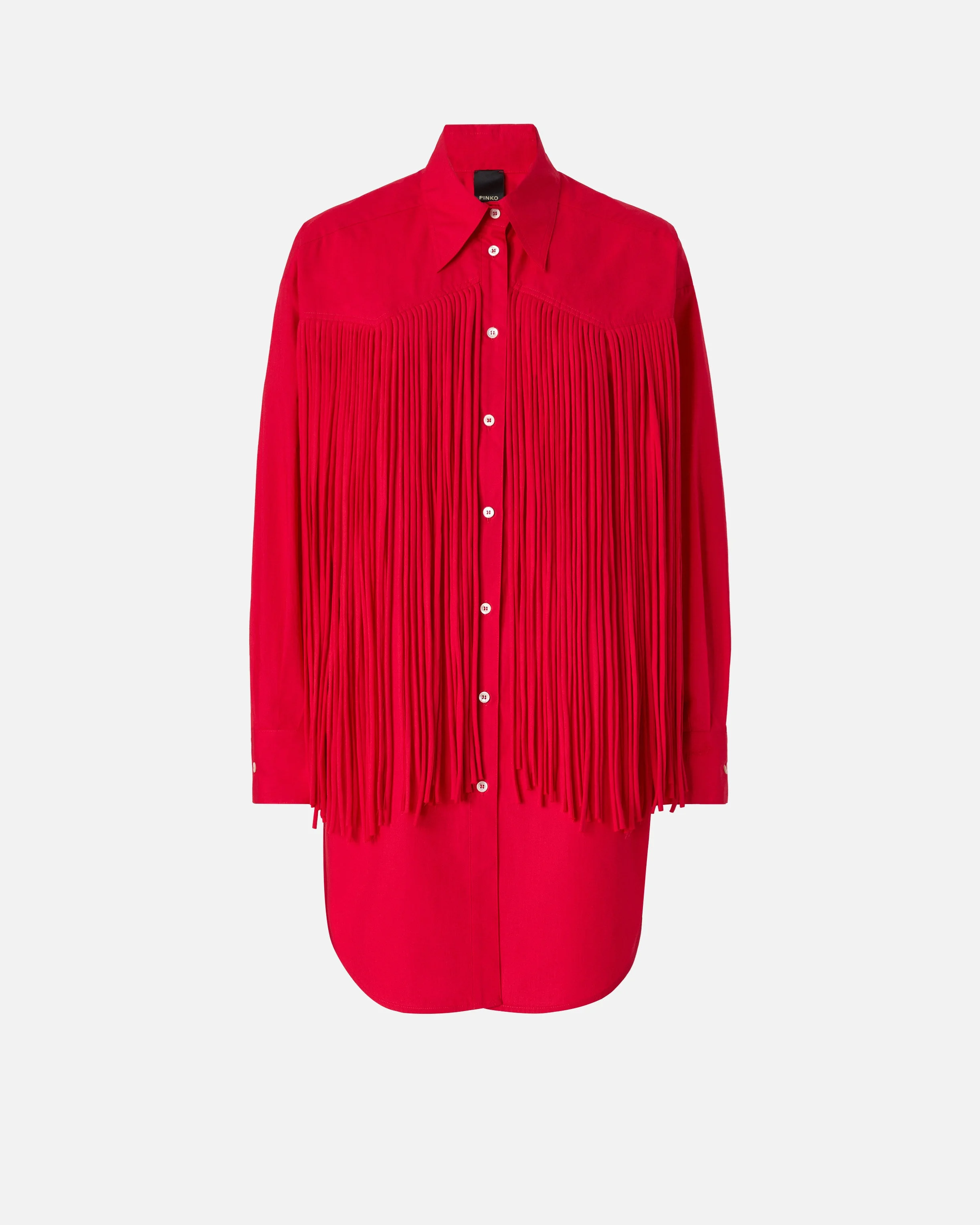 106971A2LD-RA1 Straight-cut mini shirt dress with long sleeves, shirt collar, front button placket and buttoned cuffs. This model is made from pure cotton poplin with a cool, crisp feel and features long, tubular fringes in lightweight cotton voile, applied by hand to the front yoke in a nod to classic Texan style. The dress is complete with the iconic PINKO logo lettering embroidered on the front and a slightly pointed, country-inspired rear yoke with two pleats that lend extra movement. COMPOSITION Outside Fabric: COTTON 100% - Lining: COTTON 100%