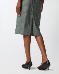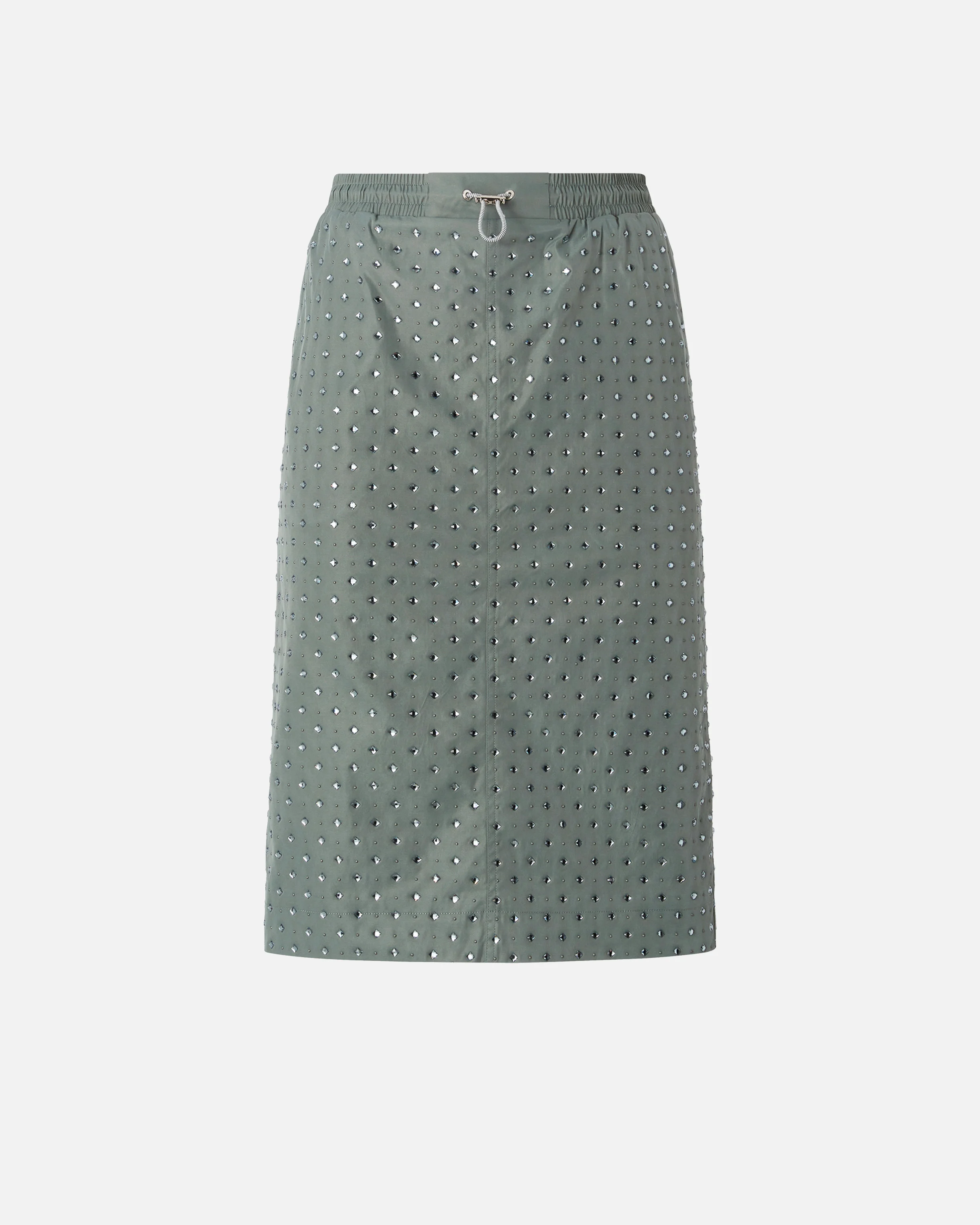 ALONA SKIRT − 105972A2XXX84 Sporty miniskirt with elasticated waistband and adjustable drawstring, entirely decorated with rhinestones that create a bright and gritty effect. The design combines glam details with a casual attitude, for a versatile and impactful garment. Wear it with a cropped sweatshirt and sneakers for a street-style look with a bright touch. COMPOSITION Outside Fabric: POLYESTER 100% - Lining: VISCOSE 95% ELASTANE 5% - : Glass 100% - : aluminium 100% Aluminium 100%