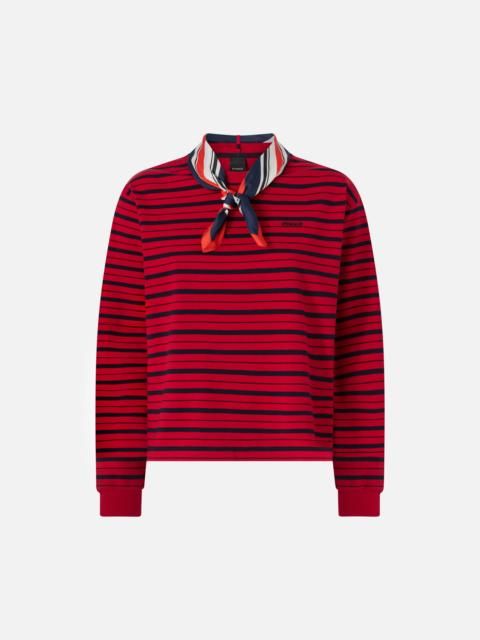 ECLAIR SWEATER − 106817A3C0RBN Long-sleeved cotton shirt with horizontal stripes, with a classic cut revisited in a contemporary key. Collar embellished with removable scarf and red "PINKO" embroidery on the chest that adds a distinctive touch. The red scarf knotted around the neck completes the look with a bold and refined accent. Ideal to wear with flared jeans and loafers for a casual chic outfit with a Parisian taste. COMPOSITION 1° Outside Fabric: COTTON 100% - 2° Outside Fabric: COTTON 97% ELASTANE 3%