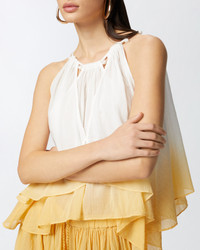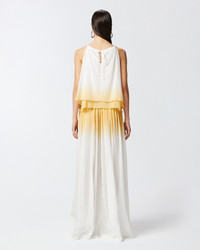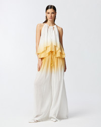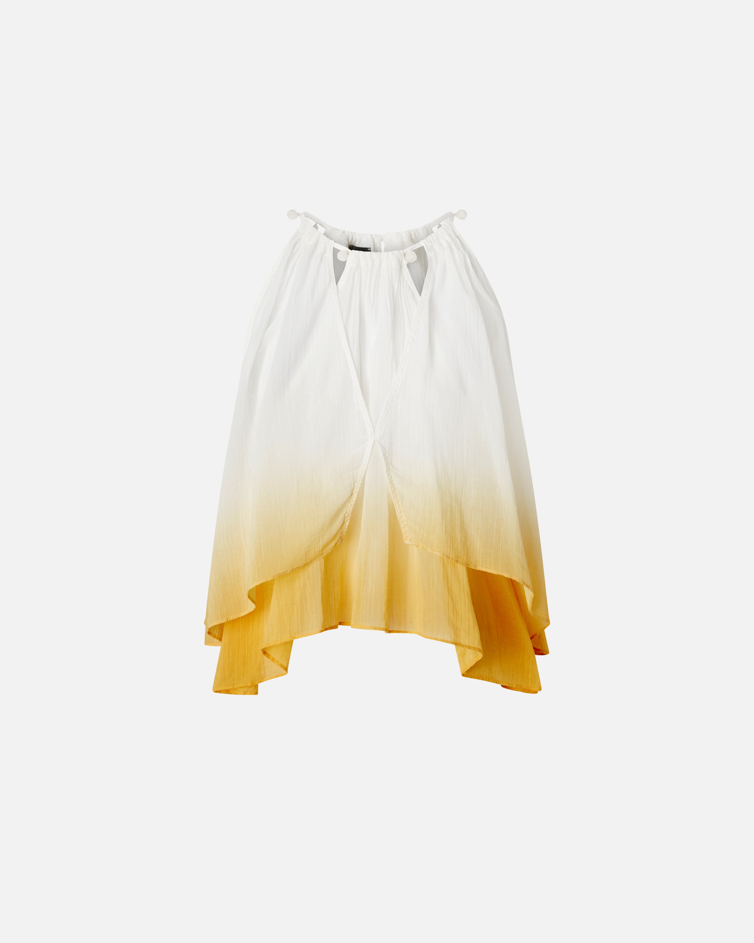 TRE PAROLE TOP − 104758A2G4S3R Voluminous sleeveless top made of very light garment-dyed pure cotton muslin, characterized by a gradient of color that goes from the bottom to the top, lightening. The particular cut of the neckline of this top, built in flounces and layers, helps to create the large and airy volume, emphasized by the lightness of the fabric. Wear the top with matching trousers, which also take up the same shade, to create a particular, feminine and impactful total look, perfect for a daytime ceremony. COMPOSITION Outside Fabric: COTTON 100% - : Glass 100%