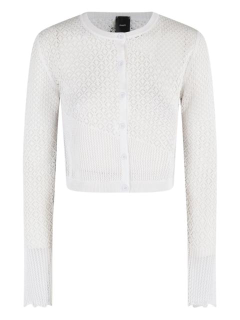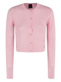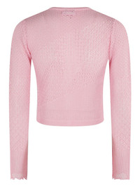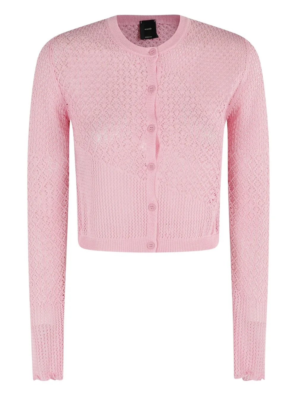 open-knit cardigan Highlights - Soft pink - Button front - Long sleeves - Diamond pattern - Ribbed hem - Open-knit design Imported Composition Viscose 88%, Polyester 12%