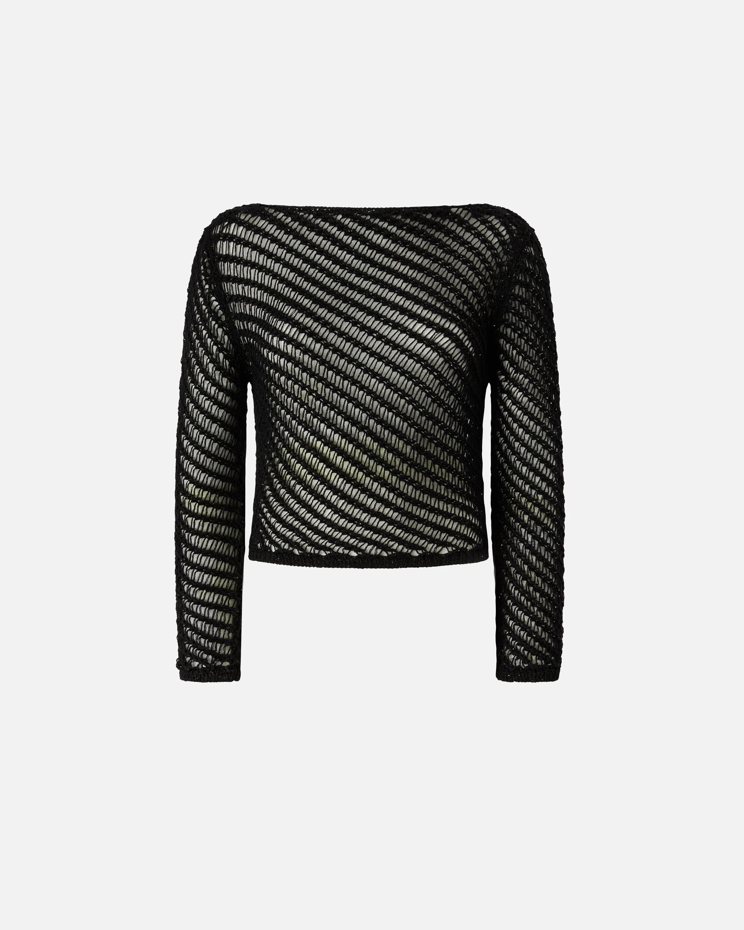 106540A36H-ZL7 Long-sleeved top worked in a crochet-style open-knit mesh with an interwoven pattern for a hand-made look. The style is embellished with tiny sequins applied to the yarn, adding a precious yet discreet touch of sparkle, while the finishing detail is the jacquard label with PINKO lettering, applied beneath the boat neckline at the back. A piece that captivates at first glance, ready to make you shine with subtle elegance on any occasion. - FAGLIA KNIT COMPOSITION Outside Fabric: POLYESTER 55% VISCOSE 45% MEASURES W: 0.37 g