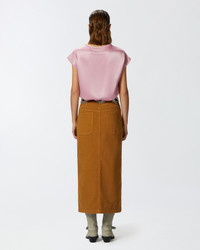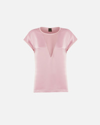 ORANGE BLOUSE − 103951A206O78 T-shirt-style blouse in glossy satin fabric with triangular, semi-transparent georgette insert at the front. Round neck and short cap sleeves. COMPOSITION 1° Outside Fabric: ACETATE 91% POLYESTER 9% - 2° Outside Fabric: POLYESTER 100%