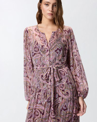 CHEESECAKE DRESS − 106729A38DNY4 Long crew-neck dress with slightly puffed long sleeves, front button fastening down to the waistline, highlighted by a fabric belt, and wide flounced skirt. This piece is made from lightweight semi-sheer viscose crepon and is embellished with a sophisticated cashmere-inspired print with metallic-thread detailing for extra radiance. The light weight and playful, feminine sheer effects—offset by the slip with spaghetti straps—make this women's dress the ideal choice for a boho-chic evening look. COMPOSITION Outside Fabric: VISCOSE 99% Metallic fibre 1% Metallised Fibre 1% - Accessory lining: POLYESTER 100%
