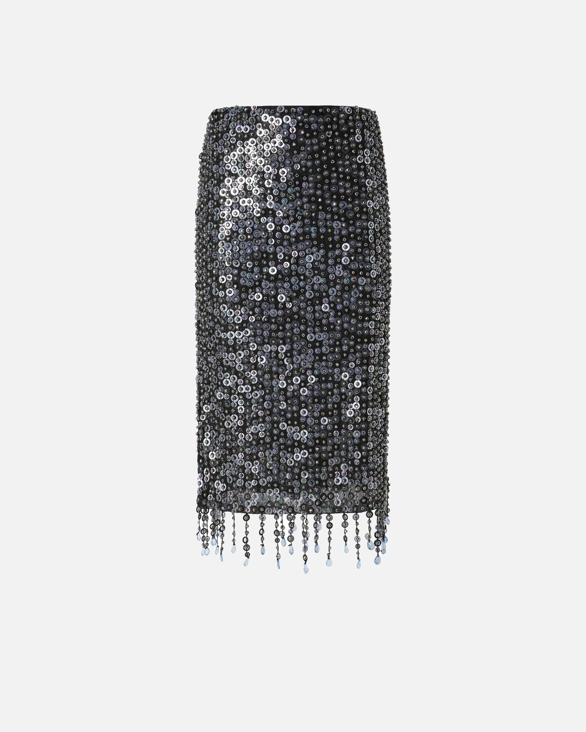 PASSAPAROLA SKIRT − 105469A2QM1GZE Pencil skirt embellished with a cascade of round sequins with glass crystals and small metal spheres inside that create shiny shimmer in black and blue tones. The hem of the piece is finished with slim fringing that falls slightly and adds a dynamic edge and movement in pure PINKO style. Wear this skirt with the matching top for a scintillating evening look, or pair it with a shirt or blouse for a more formal outfit that won't go unnoticed. COMPOSITION Outside Fabric: POLYESTER 100% - : Glass 100% - : Brass 100% brass 100% - : ACRYLIC 100% - Accessory lining: POLYESTER 100%