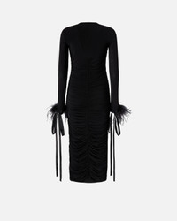 XBOX DRESS − 105780A2GSZ99 Elegant knee-length dress in light jersey featuring a slim fit and a deep V-neck. The lightness of the material allows you to create draping and gathering for an extremely feminine and refined silhouette. The focus of the piece is certainly on the wrists that are embellished with real detachable ostrich feathers with grosgrain ribbon, which in addition to adding a touch of style, also become a real gem to wear around the neck. This garment is destined to become the ace up your sleeve when the dress code is of a high standard. COMPOSITION Outside Fabric: VISCOSE 94% ELASTANE 6% - Lining: POLYAMIDE 92% POLYAMMIDE 92% ELASTANE 8% - : TURKEY FEATHERS 70% TURKEY FEATHER 70% Ostrich feather 30% OSTRICH FEATHER 30%