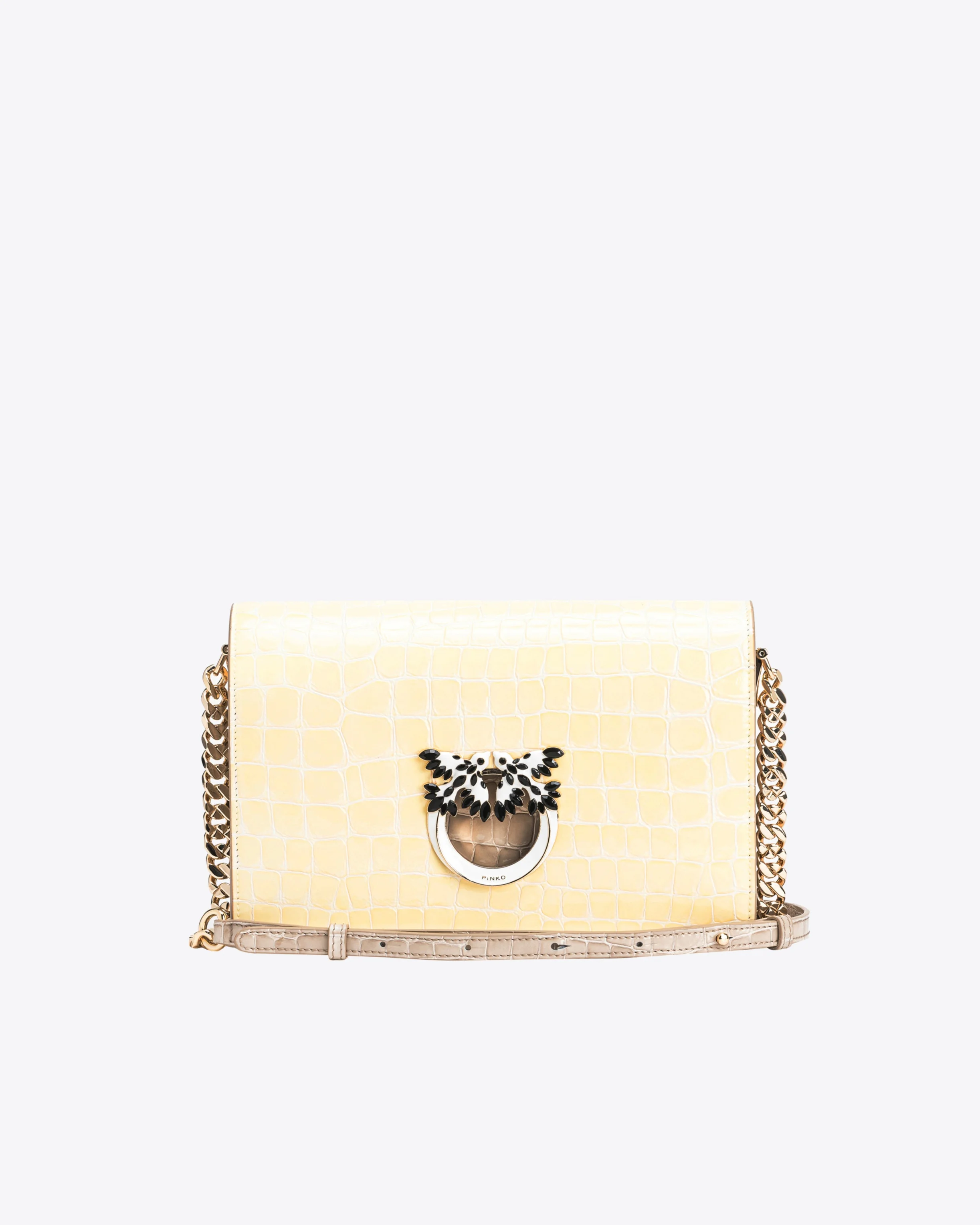 LOVE CLICK CLASSIC − 100063A1T3S14L00001 Classic Love Bag Click made from shiny and slightly embossed crocodile-print leather in a combination of two different tones. The press-stud fastening is accompanied by the iconic Love Birds Diamond Cut buckle—in light gold-electroplated metal with white enamel—embellished with pave-set black stones. Inside, it features contrasting lining, a slip pocket and a zipped divider pocket. The shoulder strap combines the classic round-link chain with a practical, adjustable leather pad. The bag is part of the Limited Edition special capsule collection which comprises PINKO Galleria-exclusive limited-edition models. Use the special NFC chip to enjoy a special experience, specific to the bag you have just bagged! COMPOSITION Leather: CALF LEATHER 100% CALFSKIN LEATHER 100% - Leather: CALF LEATHER 100% CALFSKIN LEATHER 100% - Leather: CALF LEATHER 100% CALFSKIN LEATHER 100% - Lining: VISCOSE 100% MEASUREMENTS - Height: 17 cm - Width: 6 cm - Length: 25 cm